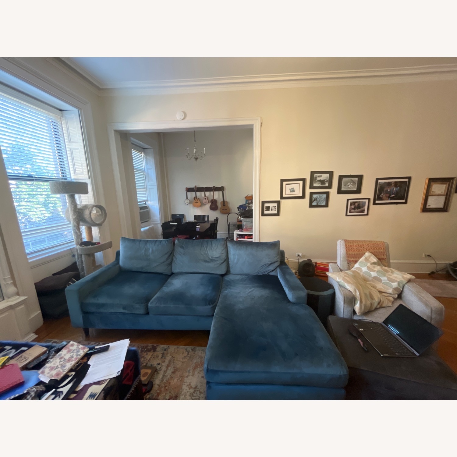 Seller's Notes:This is a beautiful microsuede couch/chaise that is very comfortable. It’s a sapphire blue Interior Define brand. Minor wear and tear but nothing that stands out. It does come from a home with a cat. Fortunately, the cat didn’t like to scratch this couch. Couch is 96 in. long, 62 in deep at chaise part( 35 inches deep at regular part) and 30 inches tall. (36 including pillows).