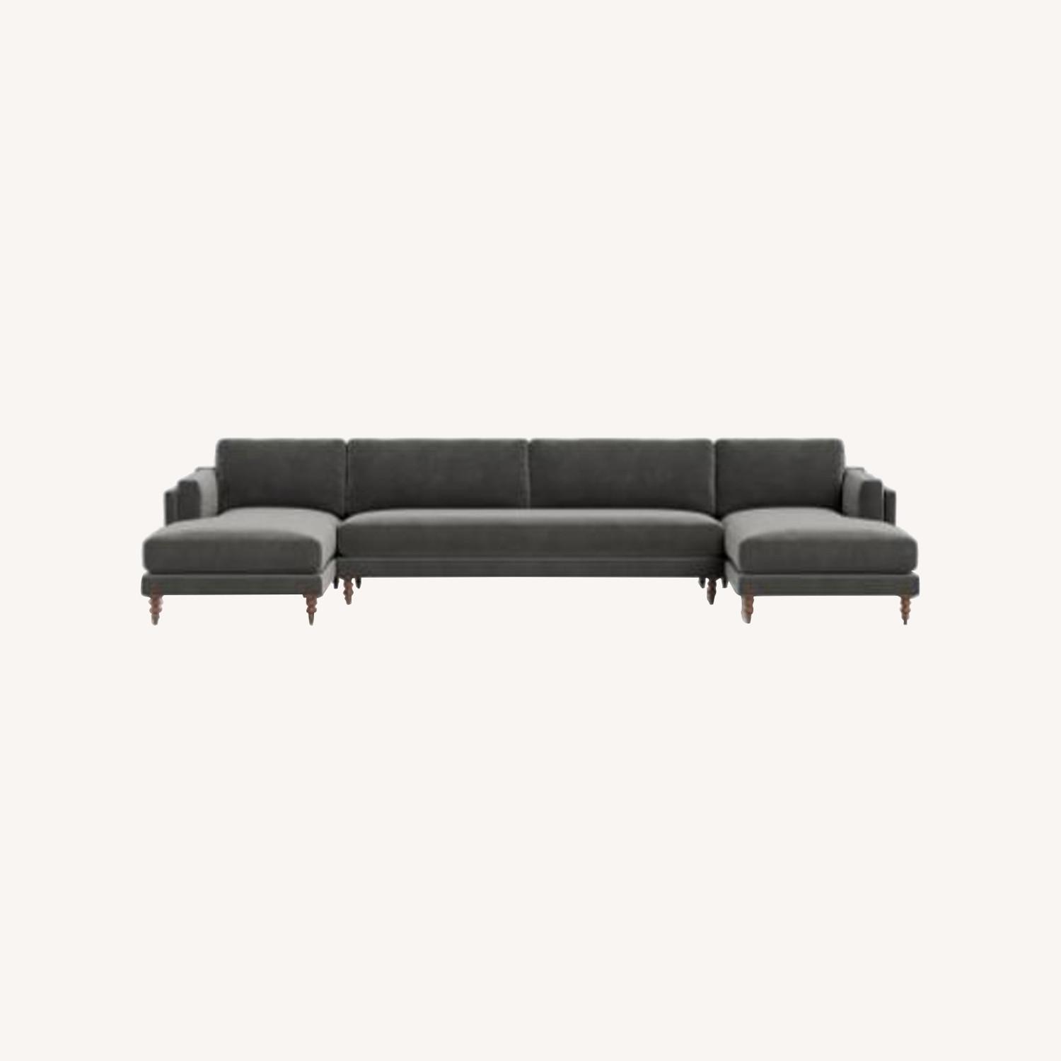 Seller's Notes:Interior Define U-Sectional purchased in 2021. Like new (there are a few small dog bite marks on two cushions), super soft plush velvet gray material with extra deep seating and extra wide chase lounges, allowing two people to sleep comfortably. Measurements included in pictures. Original Price: $4245 **PICK UP IN DOWNTOWN AUSTIN ONLY. COMES DISASSEMBLED AND WRAPPED READY FOR TRANSPORTATION**
