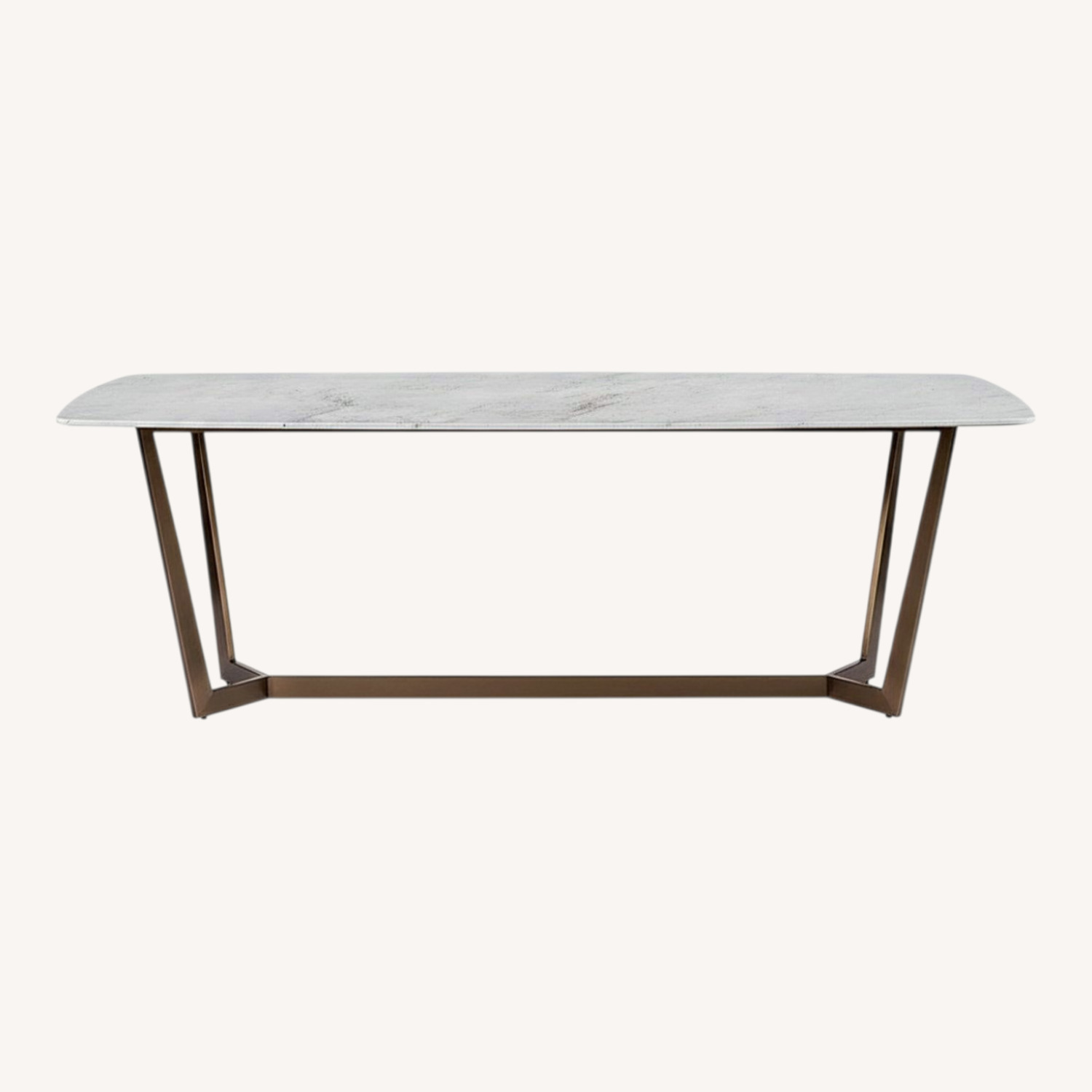 A sculptural steel base in an antique bronze finish supports a graceful and luxurious marble top in the form of the Lowell Dining Table. Granite and marble are natural materials; variations in coloration, veining and texture are to be expected. Veins, smooth to the