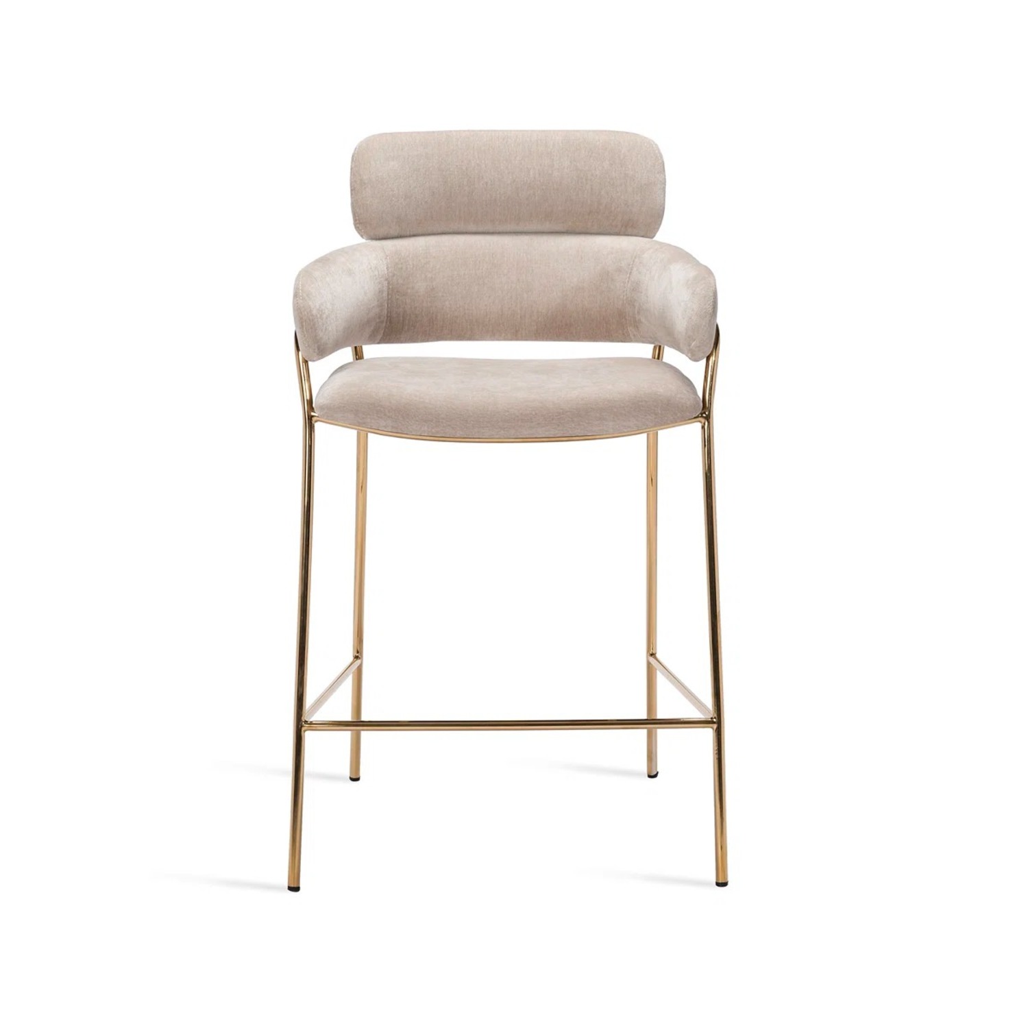 Seller's Notes:Beige “Latte” Upholstered Counter Stools with Gold Stainless Steel Frame