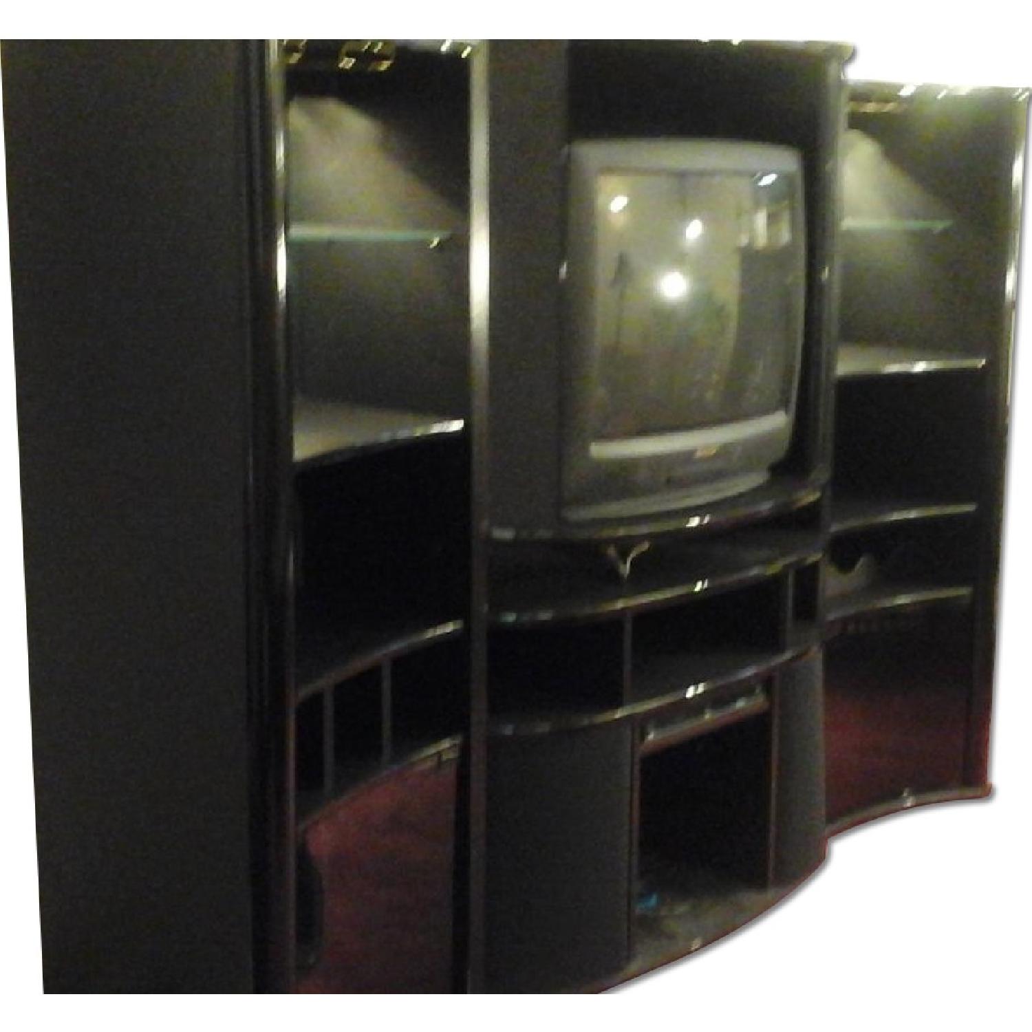 Seller's Notes:Where to start! Italian Black lacquer entertainment center with many useful features first has many opening to hold equipment\, two easy open glass doors on the top holds what ever could fit. Inside glass doors with wine rack for storage. Open shelves on the sides.