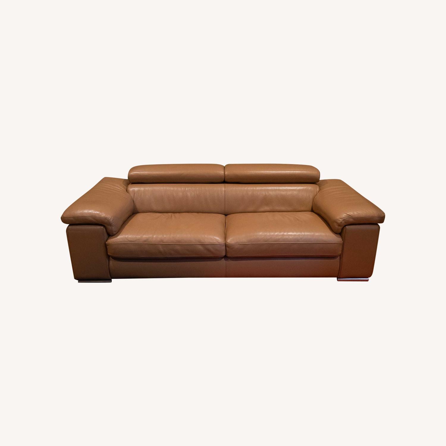 Seller's Notes:Sleek contemporary Italian leather sofa with adjustable headrest from City Schemes. Solid wood frame and metal recessed legs. I’m down sizing so need to sell, it's in great condition. The couch has some a bit more wear on the right cushion seat and a slight indentation on the right side were my end table was to close to the sofa and left a slight imprint on the leather. Color: Camel Color