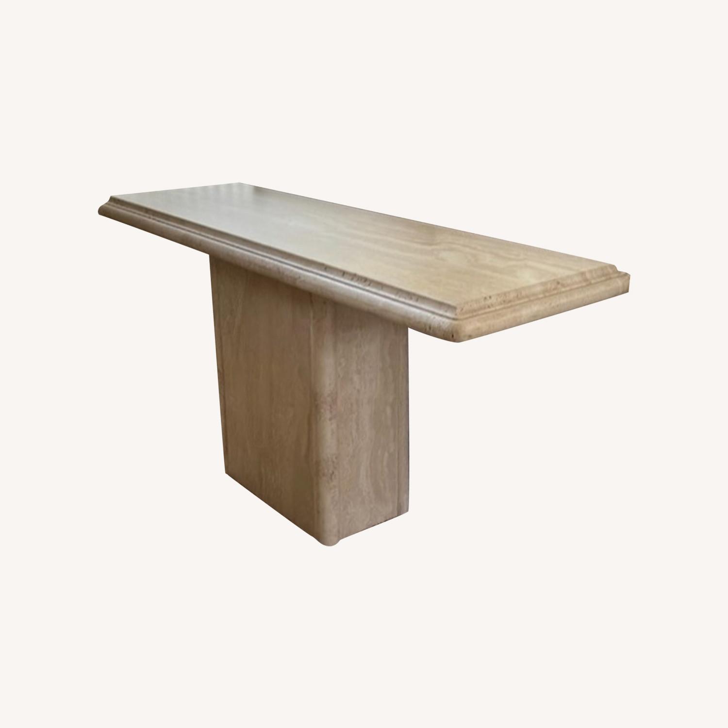 Seller's Notes:Beautiful, tall and sleek Italian rectangular Travertine Console or Sofa Table in pristine condition. The stone has a lighter beige/ivory color with neutral veining and color wave. Versatile profile works with a variety of decors. The table top is 2.75” thick and features a beveled bullnose edge. 59''(L) x 20"(W) x 29"(H) Pedestal and tabletop are heavy due to the natural stone. Matching coffee and dining tables are available in separate listings. Attention: Available for pick in early June.