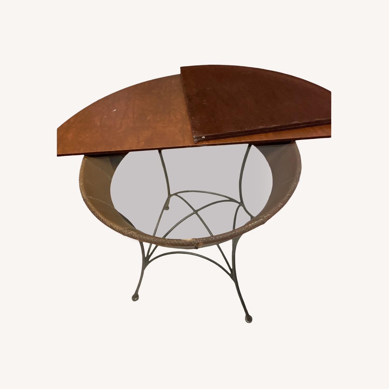 Seller's Notes:This is one impressive piece of kitchen table. You have a circular glass to supported by a circular leather insert over wire kegs. When you see this table you will say wow.in order to protect the glass from scratches or damage. I had specially made for a additional $700 dollars a circular cut to the dimensions of the glass table a removal leather cushion covering. This allows you to eat with this leather fusion on. Remove half from the table, or to remove the entire leather cushion off. You can eat with the leather cushion on if you are afraid you would scratch or you would damage your glass top, or you can easily remove it. Thus impressive kitchen table comes with two matching rustic chairs that totally enhance the ambiance look of this piece of kitchen furniture.