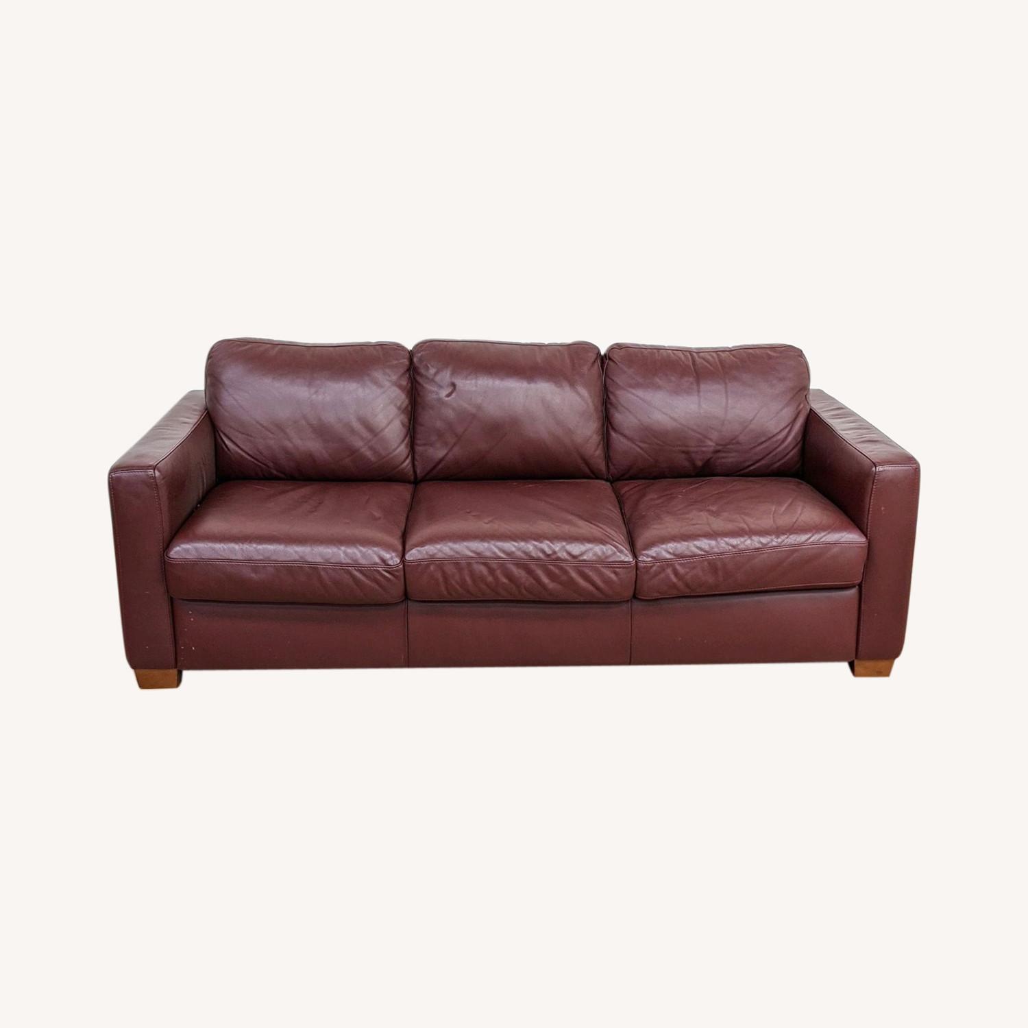 Seller's Notes:Contemporary Clean Lines Leather Sofa With Track Arms And Cushy Back Seat Pillows. Brand: Italsofa. Dimensions: 81x37x24.