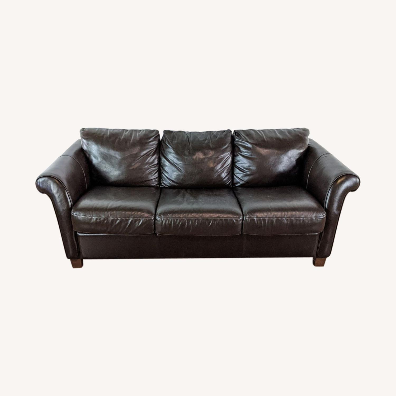 Seller's Notes:Contemporary Brown "Leather Look" Sleeper With Full Size Mattress, Curved Arms, And Plush Back Cushions Made In Italy. Brand: Italsofa. SKU#1042345