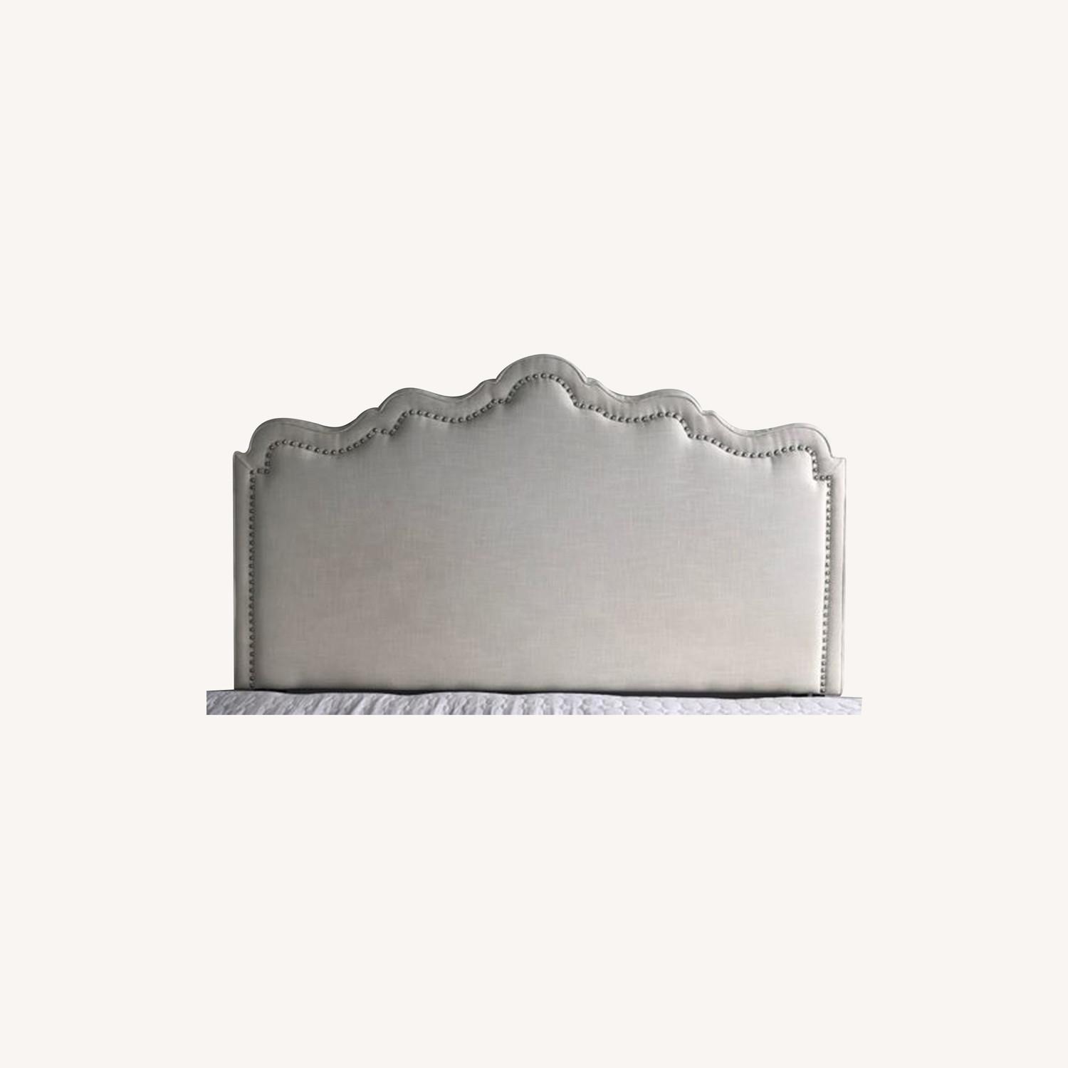 Seller's Notes:Queen size upholstered headboard with dramatic silhouette and nailhead trim. Color is ivory. Ela Upholstered Headboard with scalloped edge. Purchased from One Kings Lane. Headboard is for a Queen bed, but is pictured here attached to a King bed (using an attachment to allow it to connect).