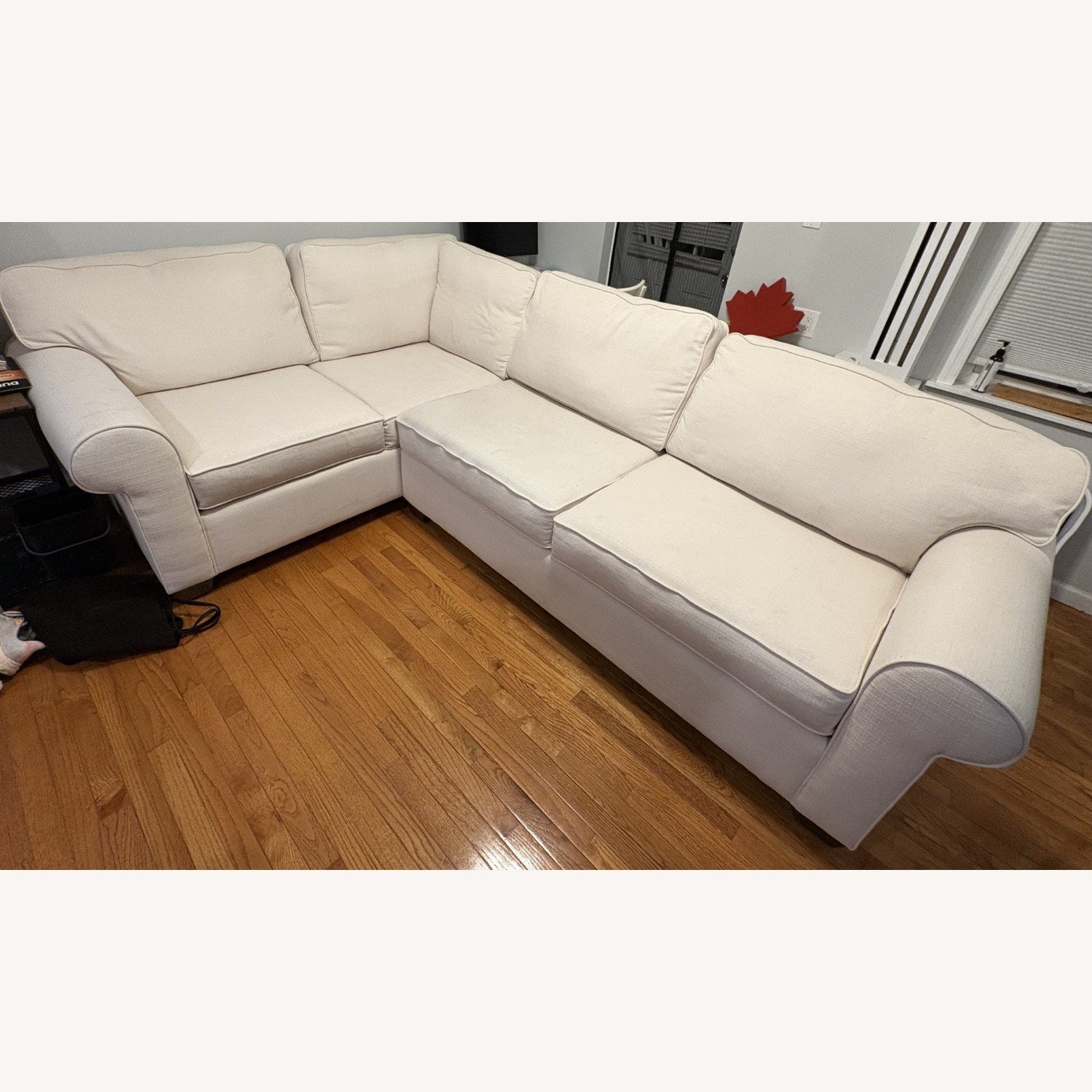 Seller's Notes:Ivory/off-white woven fabric corner sectional sofa in good condition. Comfortable, clean-looking, classic style with rolled arms and loose seat/back cushions. Great for a living room, apartment, or basement. Perfect size for napping/sleeping! See image for dimensions.