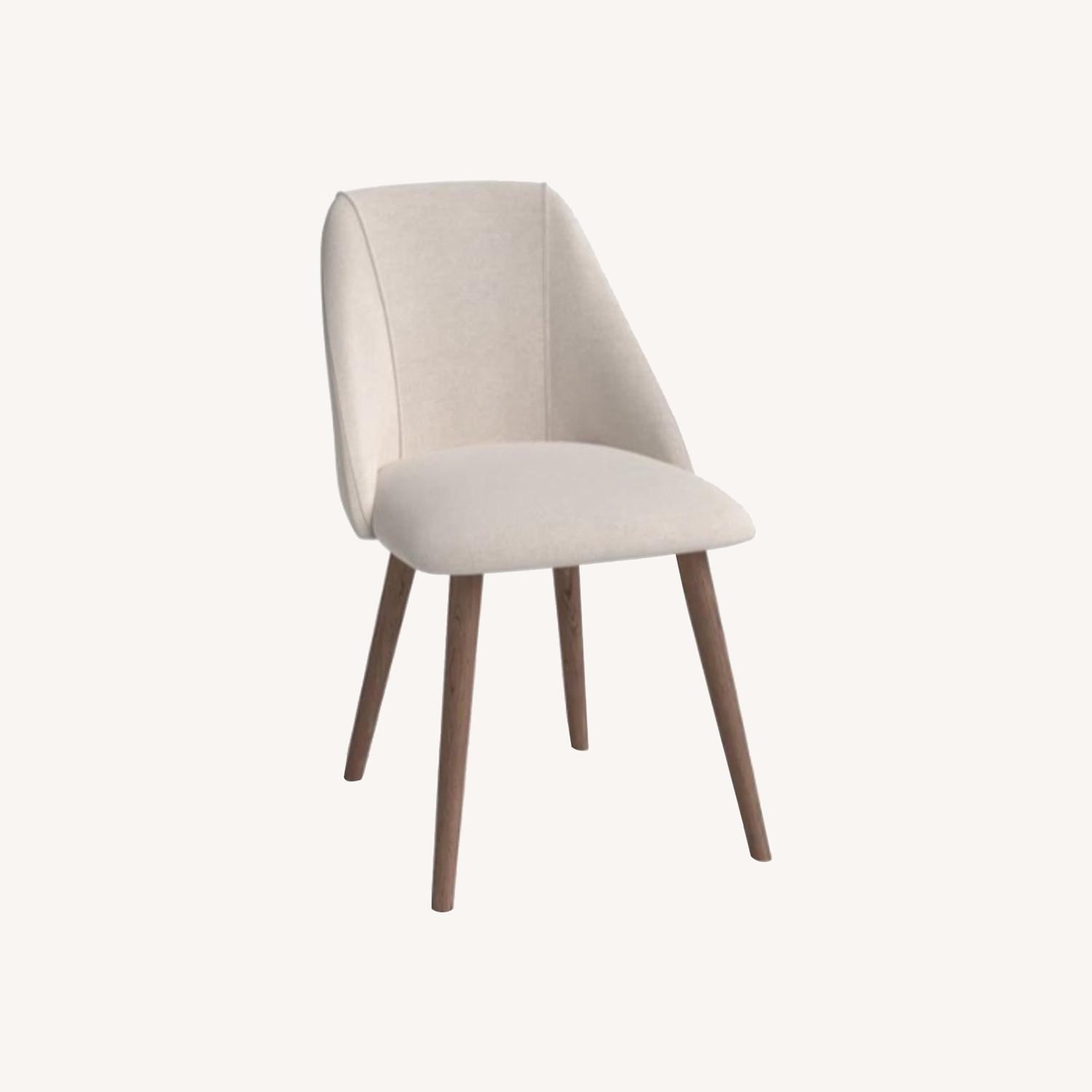 Seller's Notes:With its flared arms and contoured seat, this side chair draws on mid-century style. It serves as spare seating in the living room or office, or as an exceptionally plush dining chair thanks to its stain-resistant upholstery. The natural wood grains of the solid oak legs add warmth.