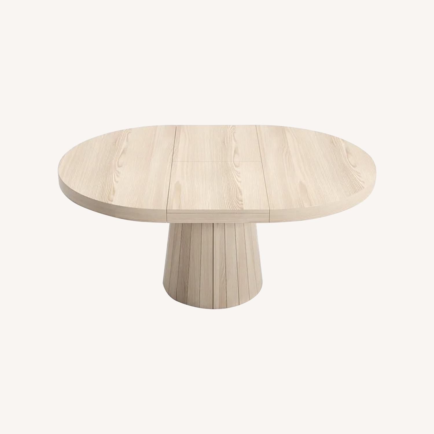 Seller's Notes:Brand new Japandi expandable round dining table from Homary. Never been used. It's white washed wood. The leaf to expand from round to oval is stored/hidden instead the table top which is a wonderful feature. We're ordered it before completing a remodel and discovered it won't work in our newly reconfigured dining space. It's great for small spaces, comfortably sits 4 while round, and expands to sit 6 as an oval. Constructed from a premium solid wood with a pedestal base, it is sturdy and durable. It's fully assembled and should be picked up or delivered as such.