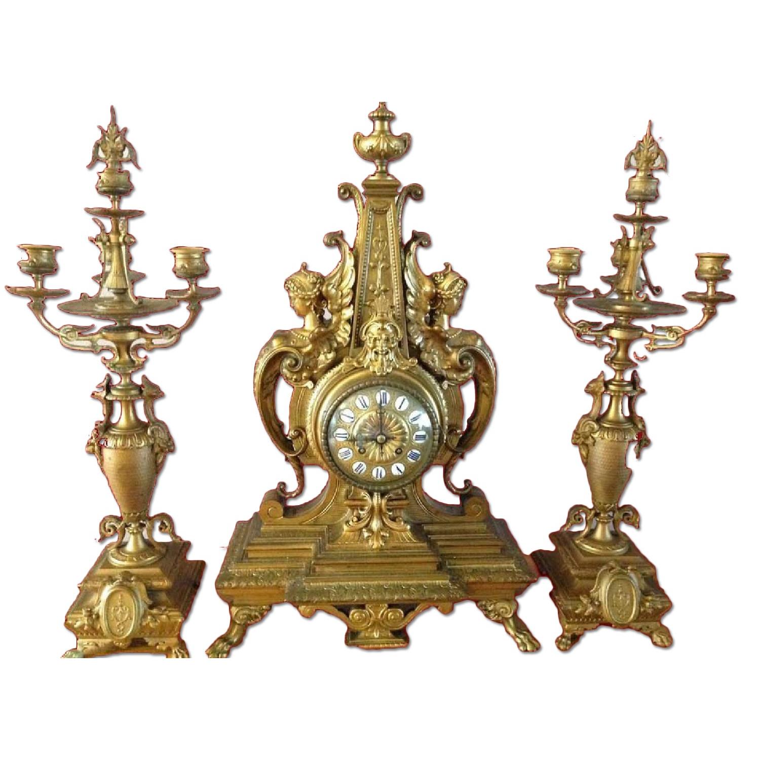 Seller's Notes:The clock and two candelabras were made from beautifully crafted heavy quality bronze, beautifully decorated with many flowery patters and branch like forms and beautiful figurines all adding up to that Louis XVI style. The hourwork was placed in the frame's midst, meaning that it is surrounded by some of the most beautifully authentic gilted bronze forms ever. On both the left and right of the clock we see two figurines of women with wings. These truly show the quality of the maker, the level of detail in which they were created is magnificent. There is also a head to be found just above the hourwork, once again beautifully crafted and magnificently real. In its midst we find the movement. The dial has parts that were made from enamel cartouches, surrounded by gilted bronze, and the details of the item overall are mesmerizing. All the flowery patterns are beautifully crafted, and the animal (lion) legs are magnificent. The clock has its key and pendulum, so it is complete. You will have a perfect quality clock! The pedestal on which this beautiful clock rests is rather sophisticated as well. We find that the Louis XVI style is very curvy and beautifully artistic, and for that to be accompanied by the stark rectangular strong forms of the pedestal on which it all rests creates a very strong image and work of true art. It chimes beautifully every half and full hour. It has been checked and cleaned by a professional clockmaker. It works perfectly fine. The measurements are: •Clock: 60 cm high x 38 cm wide x 18 cm deep • 24 inch high x 15 inch wide x 7 inch deep •Candalabras: 58 cm high x 17 cm wide x 17 cm deep • 23 inch high x 7 inch wide x 7 inch deep Next to this beautiful clock we find two candelabras. These can hold four candles (three on the sides and one on top if you take off the top lid). Once again beautifully decorated, with a vaze on a square pedestal and a medaillon in the pedestals midst. They also rest on four lion paws. This 100% authentic and complete set would suit in any kind of room. It is very sophisticated, very useful in practise, and will always be worth its money. It was made in a very heavy quality. The movement of this clock has two stamps; •Japy freres.' It further says: 1855 Medaille 1844-1849. •J. Lefebvre Fils Paris