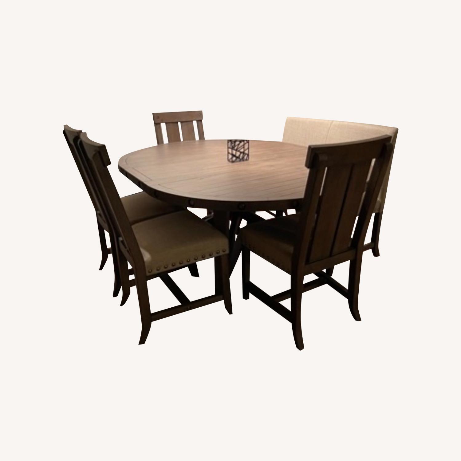Seller's Notes:Hi all! I’m selling our gorgeous Jaxon Grey Wood Dining Set from Living Spaces. We have downsized and no longer need as many table seats anymore after moving out of state. The set comes with: - 1 round table with base (54"W x 54"D x 30"H) - 4 high back upholstered chairs - 1 high back upholstered bench (seating for two) - 1 table leaf 18” extension (extends table to fit comfortably 6+ chairs!) This set retails new for $1,500. There is no stains, rips, tears, but a few minor blemishes that blend in with the natural distressed look of the set. It comes from a smoke free household with one cat, who has not caused any damage to the table. I’d love to see this go to a great home. ?