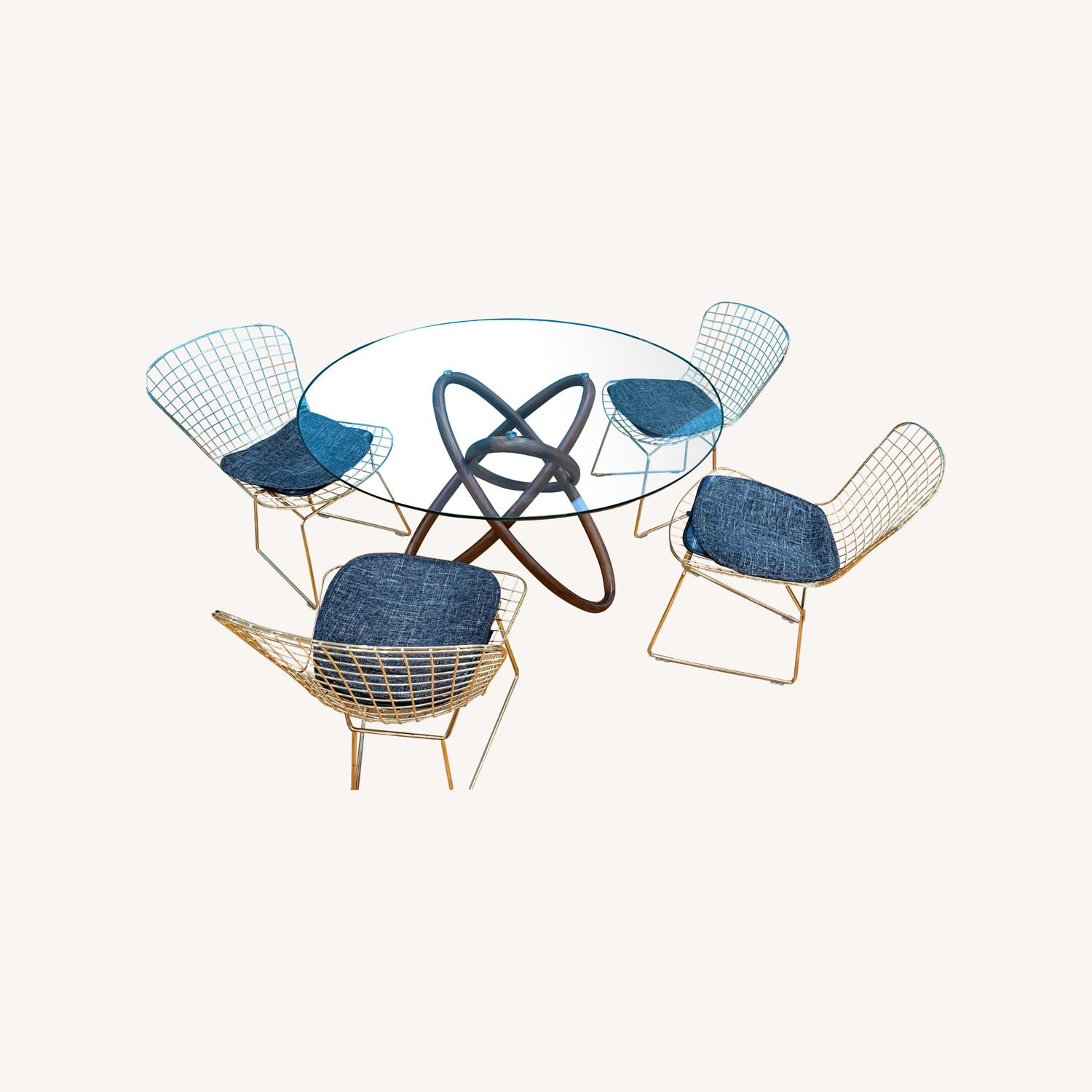 Seller's Notes:Bring instant style to your dining space with this stunning contemporary dining set. • Table: Thick tempered glass top with sculptural walnut-finish basej • Chairs: 4 sleek gold wire chairs with black seat cushions • Condition: Excellent – gently used, no chips or cracks in glass, sturdy chairs, minimal wear