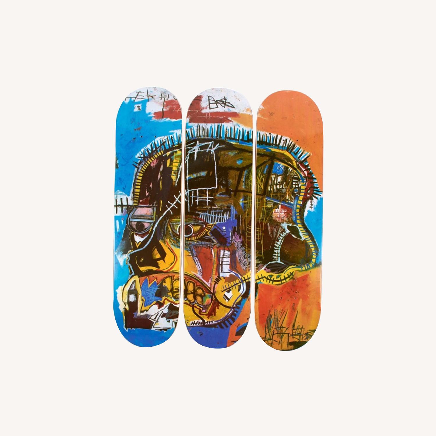 Seller's Notes:This skateboard triptych skull, an exclusive collaboration with the Estate of Jean-Michel Basquiat, features one of the artist’s iconic paintings from the early eighties “Untitled – Skull” (1981). Each deck measures: 31.5″ h x 8″ w x 0.5″ Material: 7-ply Canadian Maple Wood Signature stamp – Skateroom Wheels and trucks are not included