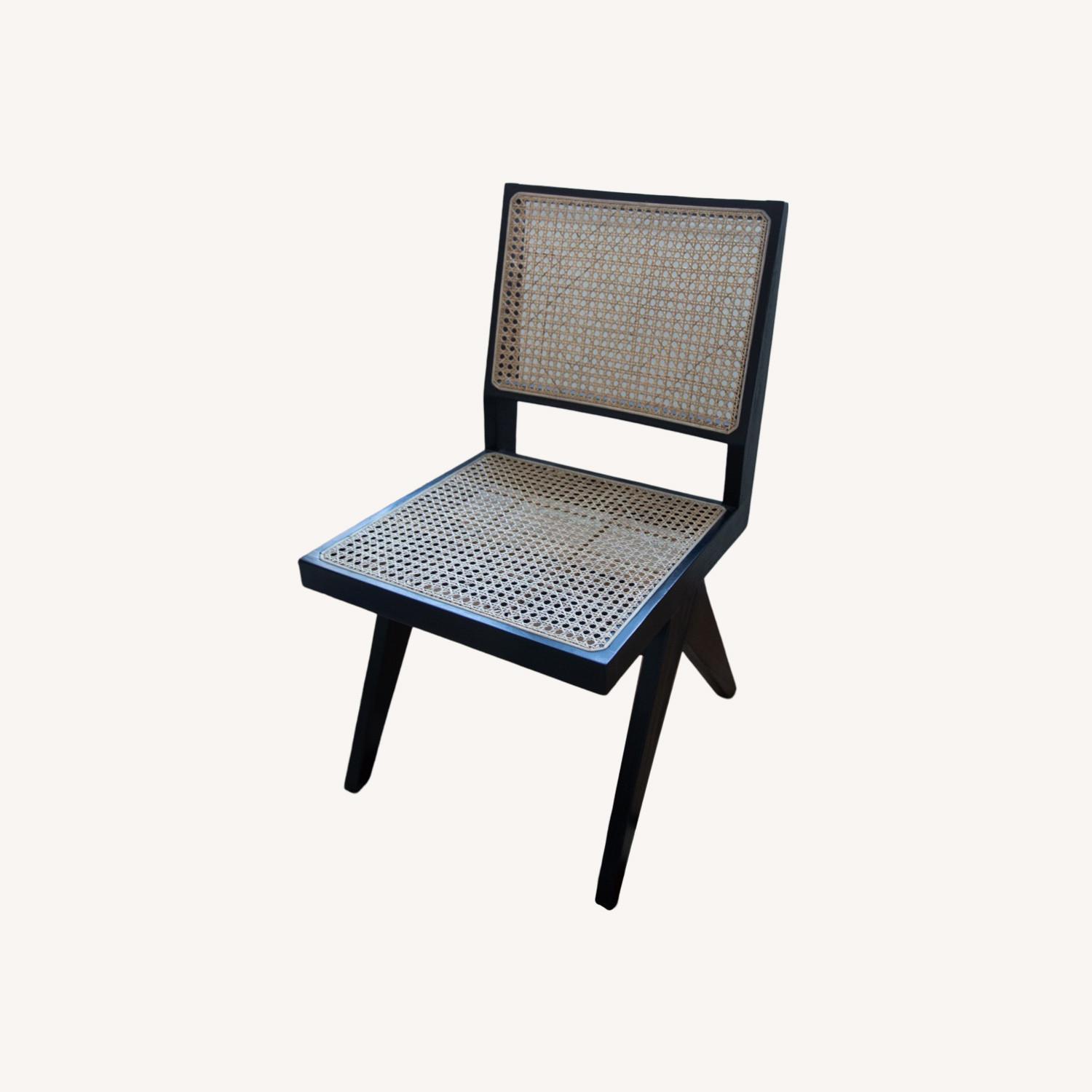 Seller's Notes:We bought this side chair 2 years ago for our guest room, but are now moving so unfortunately we have to let go of it! It's a super stylish addition to any room and adds that chic touch with a cane seat and jet black frame. It's in mint condition as it was more of a decorative accent chair and not used often. Info from website: Contemporary touches, like its sleekly carved lines, add interest to the more traditional appeal of hand-woven caning in this sungkai wood chair. An ideal blend of old and new, it is available in a rich black finish that allows it to be easily integrated into almost any decor. Product Overview Finish: Charcoal Black Dimensions: 19.5"W x 24"D x 36.5"H Material: Teak w/ Caning Seat Height: 18.50" Weight: 14 lb