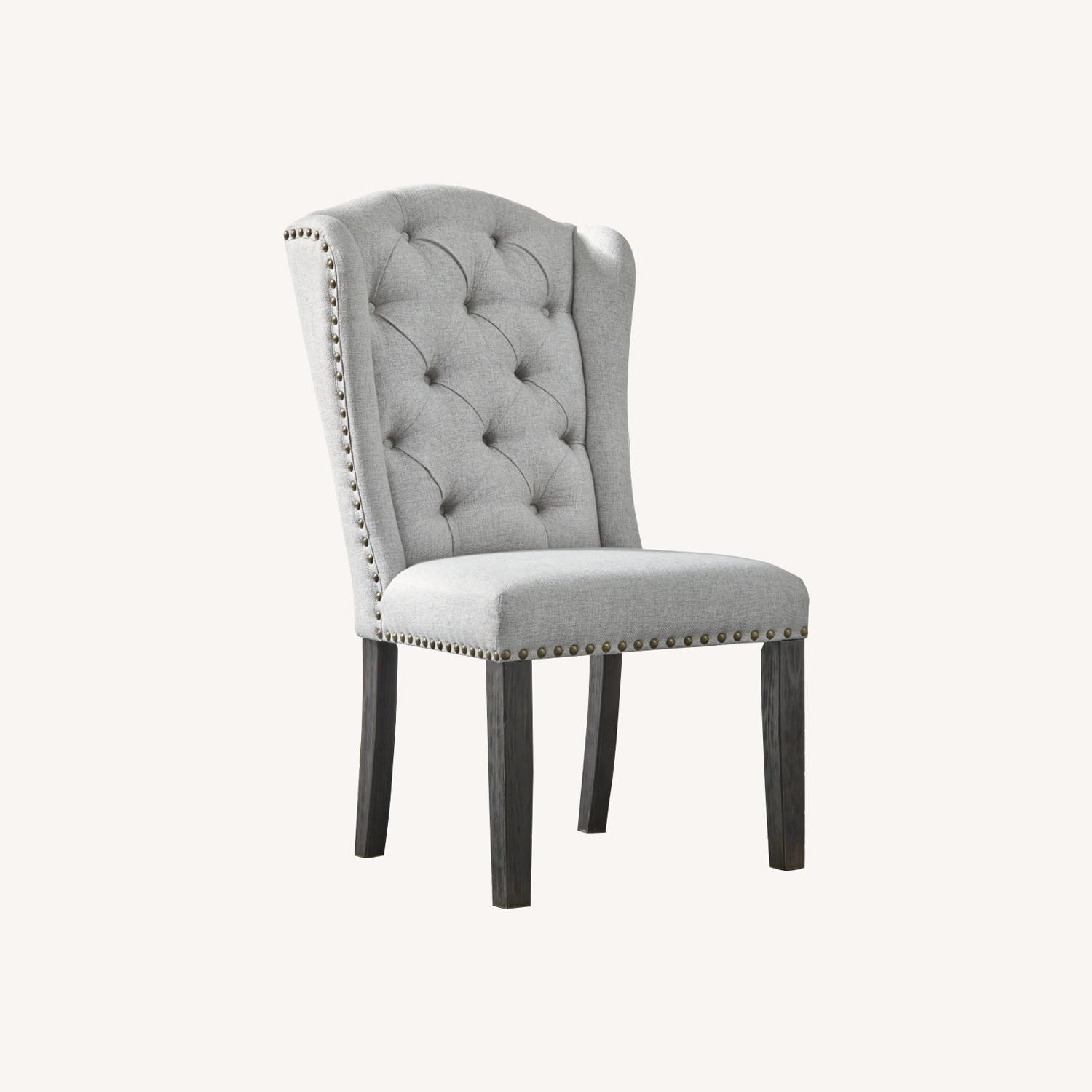 With its fashion-forward take on timeless wingback styling, the Jeanette upholstered dining chair is a feast for the senses. Richly neutral linen-weave upholstery is punctuated with nailhead trim for trendy flair. Deep button tufting enhances the luxurious look and feel, designed to make gathering around the table an easy-elegant experience.