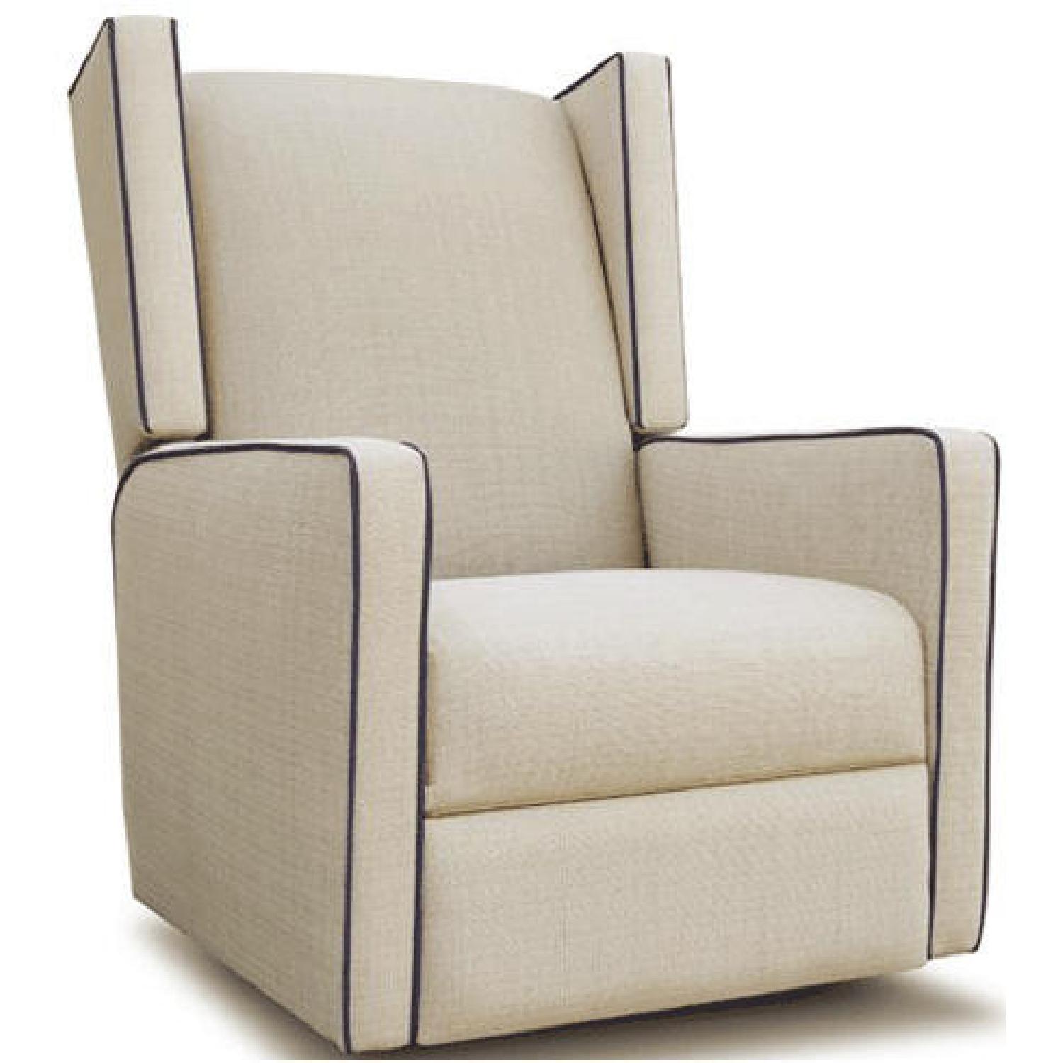 Seller's Notes:A beautiful chair to complete your nursery. It glides, reclines (45 degrees), and swivels. Gorgeous linen material with navy blue piping. There are some minor imperfections as shown in the photos.