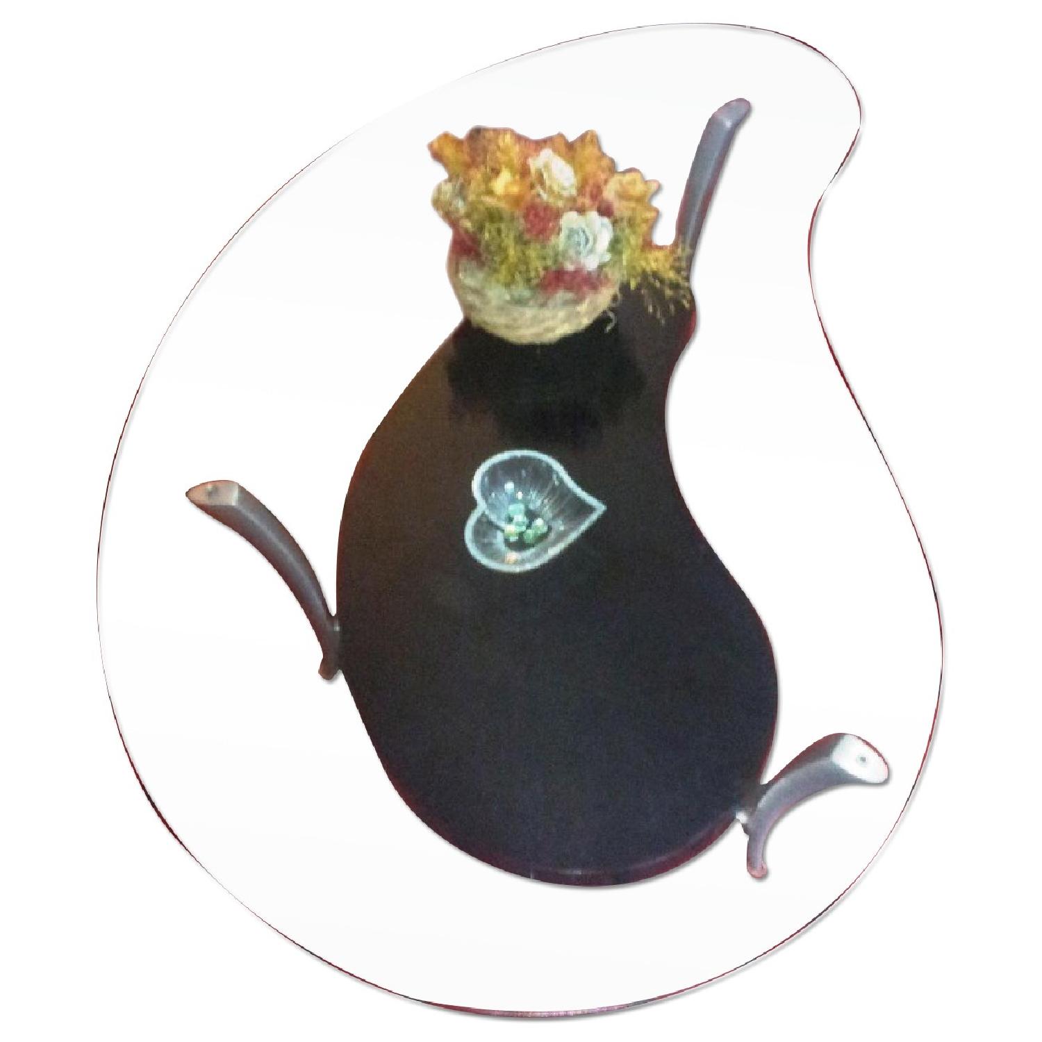 Seller's Notes:A great thick glass top, unique shape and 2.5 inch black base make this a great addition to your living room/ home.