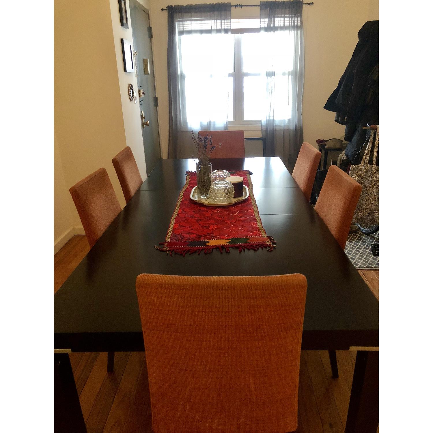 Seller's Notes:This table is absolutely incredible. The phots are shown with the leaf in but can easily be removed. The 6 chairs are a soft orange color and compliment the black table. A great piece for dinner parties or gatherings.