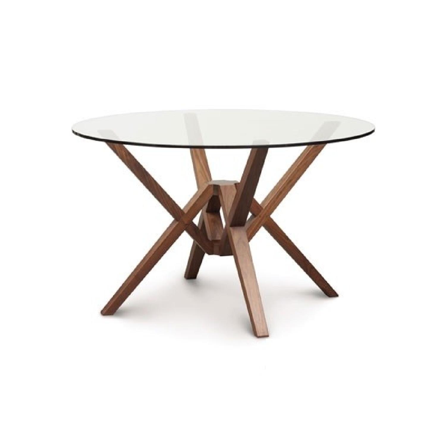 Seller's Notes:Glass top table that comfortably sits 4. American Black hardwood base with a natural finish.