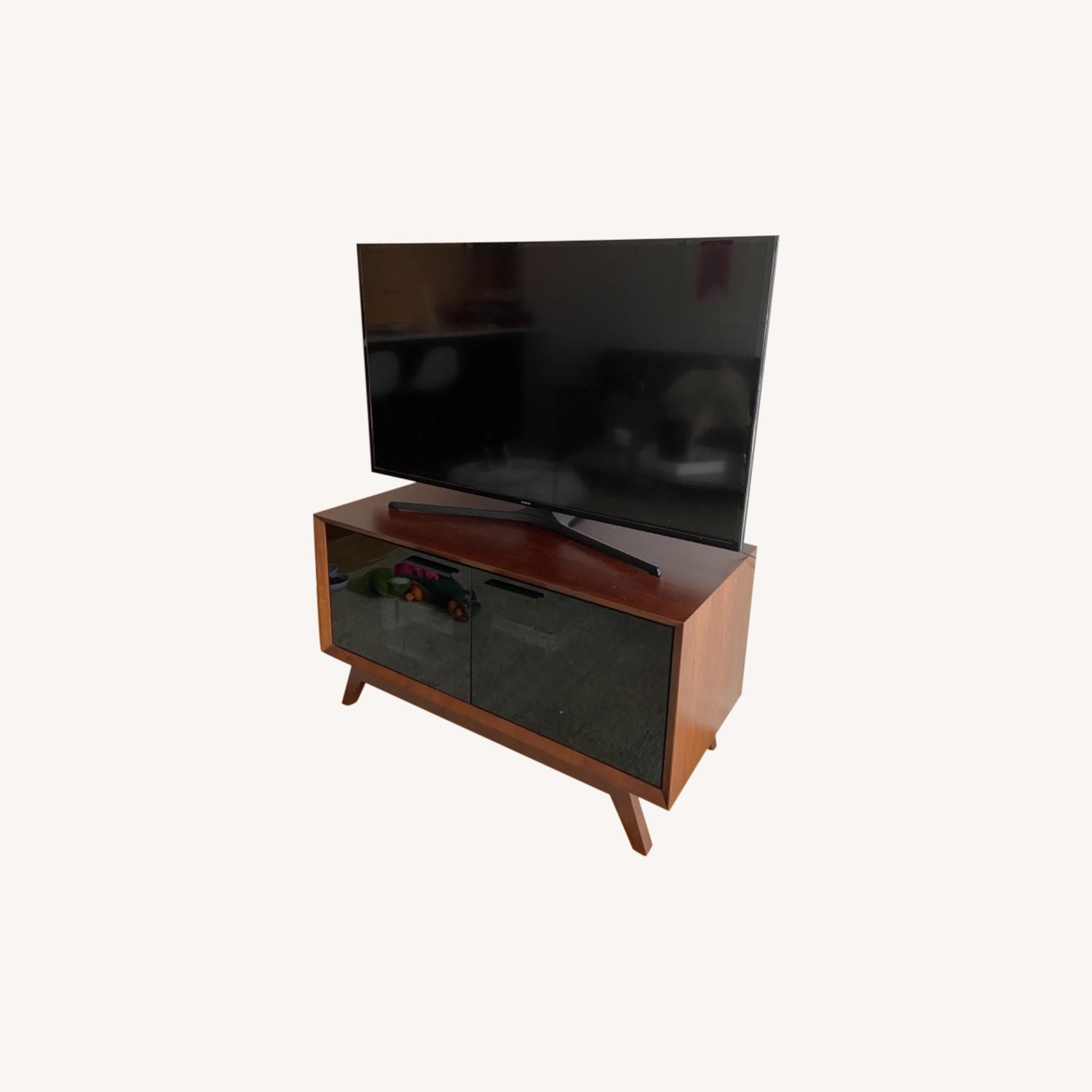 Seller's Notes:This gorgeous media stand is made with chocolate walnut and features black glass paneled cabinets. (Perfect for hiding away a cable box, router, etc.) It’s seen here with a 50” TV but could accommodate larger or small TVs as well. A beautiful midcentury piece that I am sorry to have to part with as I downsize!