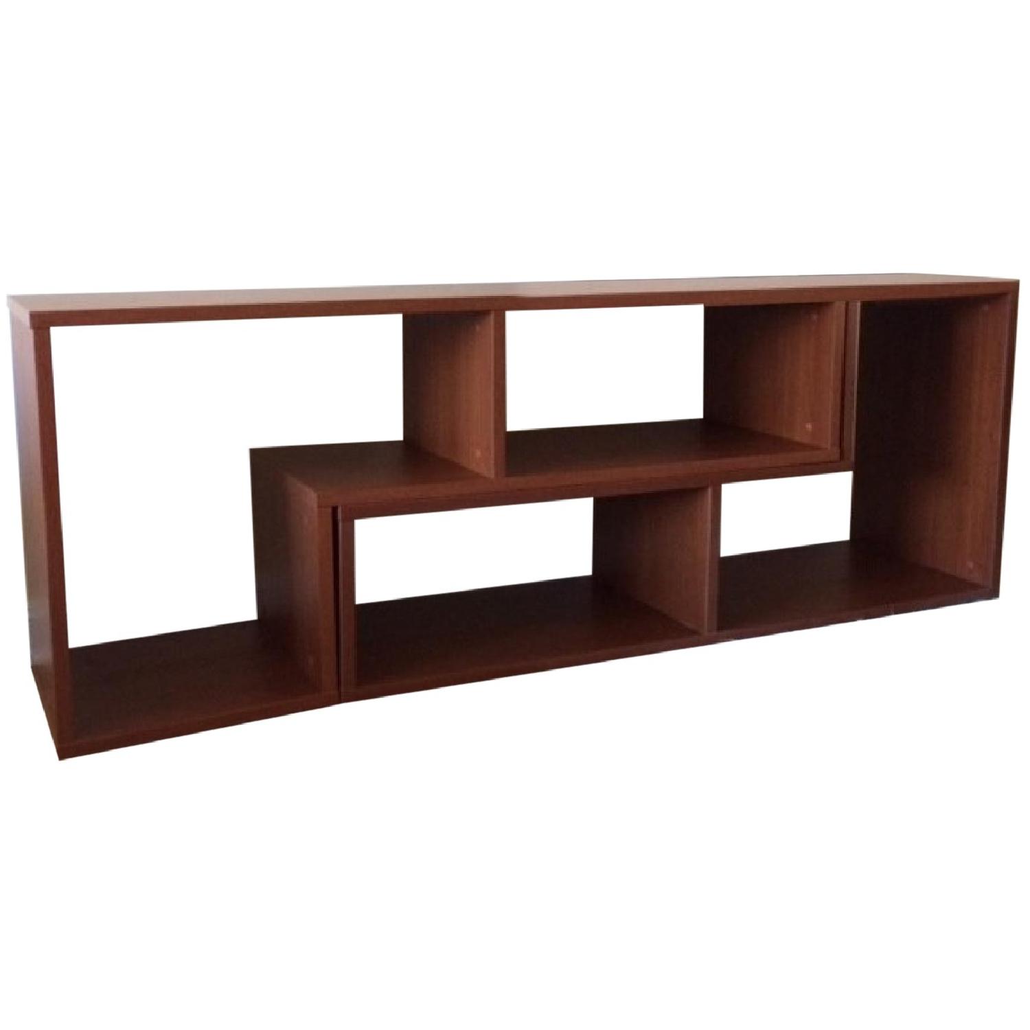Seller's Notes:Great bookcase, room divider, console table or toy storage in cherry. 2 Modular, L-shaped pieces can form two spacious shelving areas for books, photographs, and collectibles, - one can be ideal for a small office space or child's room, two to create an attractive TV stand, or to create an open wall unit or room divider. This is less than a year old- and the set of 2 retails online for $498 + tax. Photos show one piece alone, 2 pieces and 3 together with books in it. Dimensions of each piece: 59W x 18D x 28H inches Full details at: http://www.hayneedle.com/product/jesperexpandopuzzlebookcase.cfm