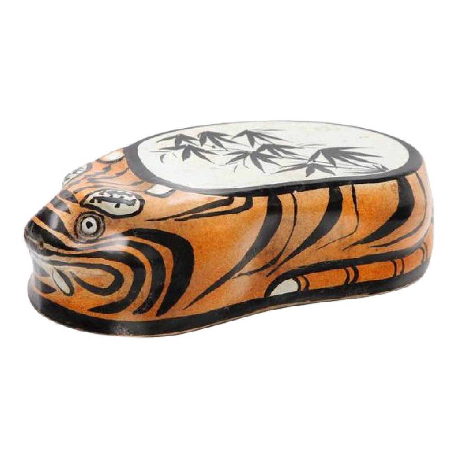 Seller's Notes:The pillow is assembled with a hollow construction, its molded form covered with a white slip. An orange brown slip is applied to the body, excluding the back, ears and eyes which remain white; brown-black brushstrokes create the tiger’s stripes and features and the bamboo branches.The pillow is then coated with a transparent glaze and fired at a high temperature. The foot is unglazed. The nostrils are formed by the vent holes. 13 in. Long. This is an example of Northern Cizhou ware, made from gray stoneware and white slip applied to refine the surface. Used in summertime, this pillow for sleeping takes the form of a tiger because, according to Chinese lore, the tiger frightens away malevolent spirits. A similar Cizhou-type tiger-form pillow, decorated on top with a panel of a swan swimming, is illustrated by Jiena Huo in Fire and Earth: Early Chinese Ceramics (3500 B.C. - 1400 A.D.) in the Museum of East Asian Art, Cologne, 2008, p. 187, no. 147, where it is dated Jin dynasty, 12th century, and suggests that it is probably from Changzhi, in Shanxi, where other pillows of this type have been found. Another similar pillow, decorated on top with a bird perched in bamboo, in the Avery Brundage Collection, Asian Art Museum, San Francisco, is illustrated by M. Tregear, Song Ceramics, New York, 1982, p. 82, no. 79, where it is dated late Northern Song-Jin dynasty, late 12th century. A very similar Cizhou-type tiger pillow realized over 68,700 USD at Christie’s (March 2014). The Brooklyn Museum is just one of the many esteemed collections of Asian art to hold similar examples. To say this tiger’s new owner will be in good company would be a major understatement! (Brooklyn Museum 1993.56)