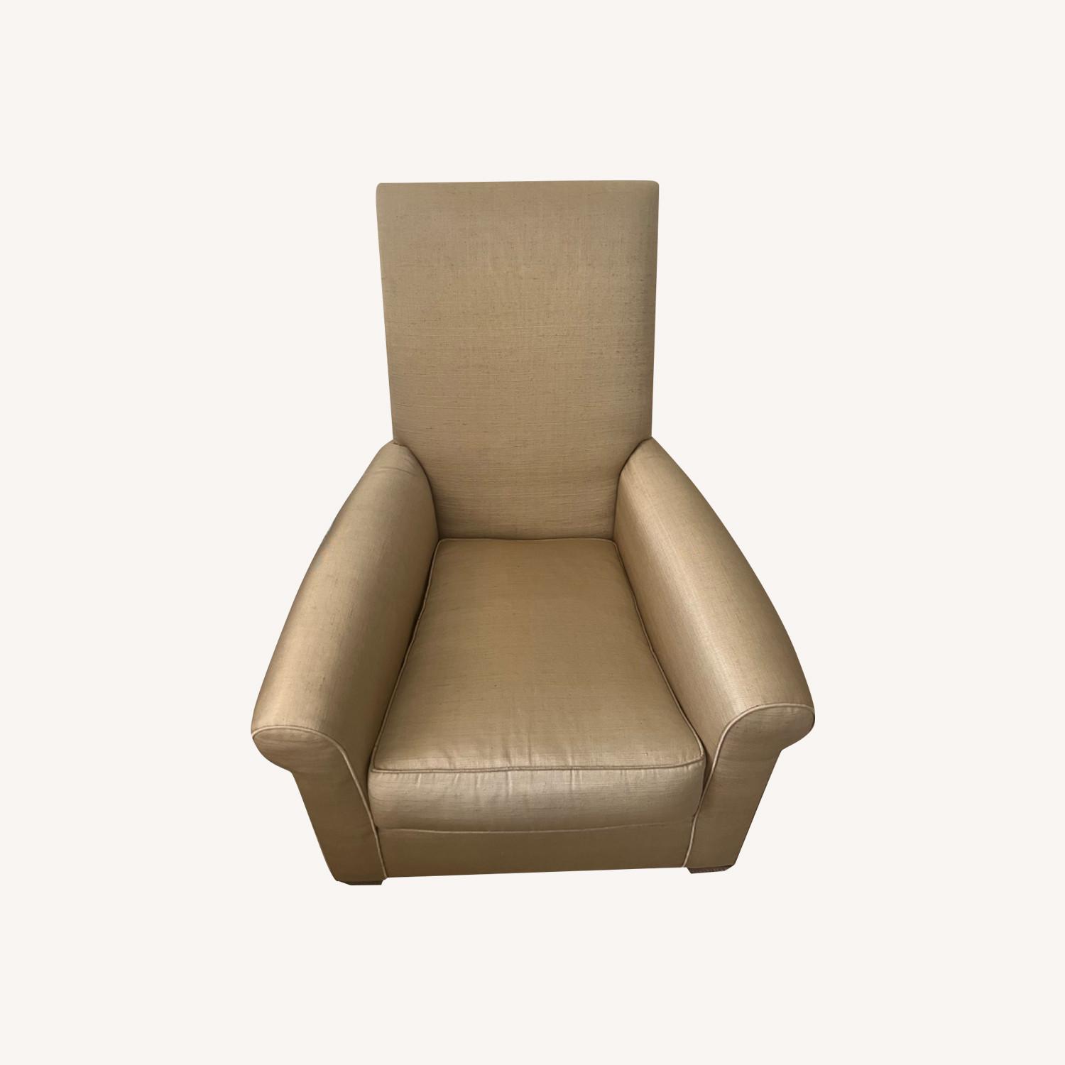 Seller's Notes:One of the late John Hutton’s classic designs - fully upholstered in a toasted camel silk linen fabric with loose seat, tight back with feet finished in mahogany stained maple wood. Upholstery shows some stains and signs of gentle wear and tear but these are timeless classics.