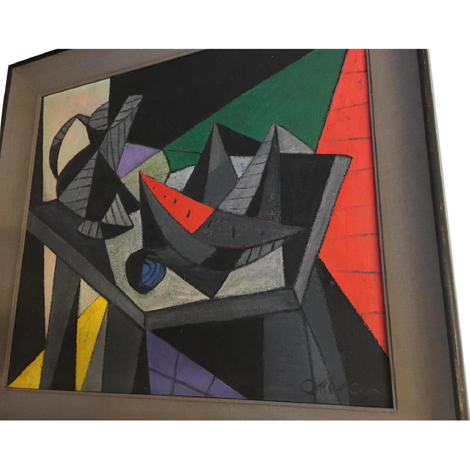 Seller's Notes:This is an original John "Jack" Otterson abstract modernist painting. I believe this is acrylic, but may be oil. Jack Otterson was an American art director for film, who was educated in art at Yale. Mr. Otterson was nominated for eight Academy Awards for Best Art Direction and he worked on 300 films between 1934 and 1953. An abstract by Mr. Otterson was used in the set design for the television show Frasier and his art is included at the Yale Art Museum in New Haven, Connecticut. This painting is in grays and blacks with pops of primary colors including red, purple, blue and yellow. It appears to be an abstract still life of a table, perhaps with a slice of fruit. It would be a perfect addition to your mid-century modern decor-- a true center piece. This painting is large measuring approximately 29 x 35 itself and 25 x 39 with the frame. The exterior frame (there is no glass-- this is a frame as is intended for paintings) is a gray fabric with a black wood border. The fabric has a few holes/tears (as shown in the photos) and the black trim has areas where the paint has worn off). It could use either a new frame or some restoration work to the existing frame. There is also water staining on the back of the piece but this has not impacted the front of the art work.
