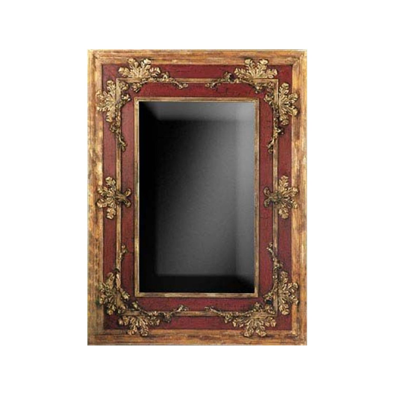 Seller's Notes:John Richard Designer wall or floor mounting. Mirror is extremely large and heavy. Suited for great room mantel or open floor. 54"Wx72"Hx2"D. Mirror is wood with antiqued coral red and gold trim. Raised design trim with distress marks. One corner needs repair/re-glue raised gold embossed trim. Model is JRM #515.