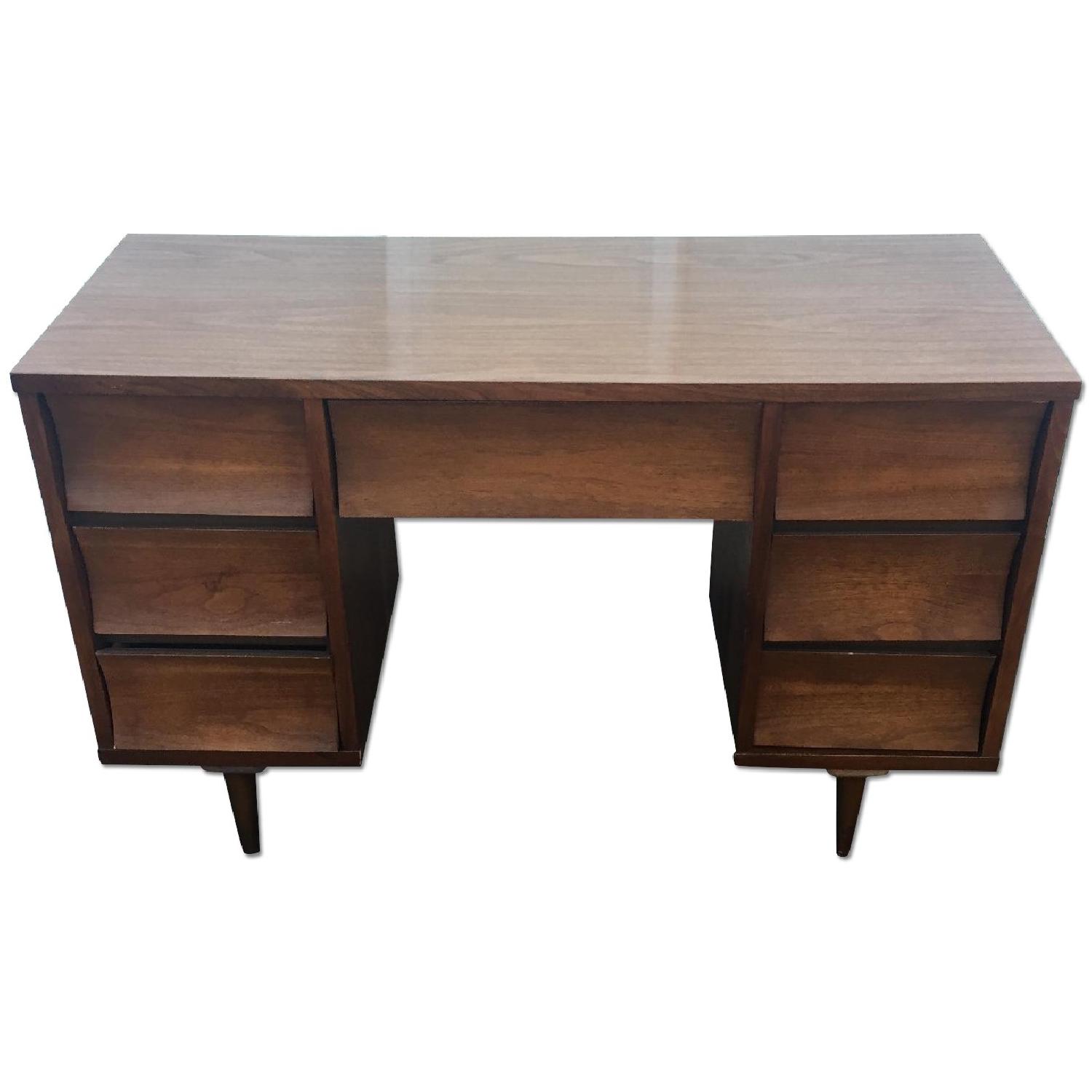 Seller's Notes:This mid-century desk by Johnson Carper features unique sculpted drawer fronts, durable formica top, and plenty of storage. Great writing desk for any setting. Some age aporopriate wear including veneer chipping, edge wear, corner dings, some scuffs. Dimensions: 46w 17.75d 30h