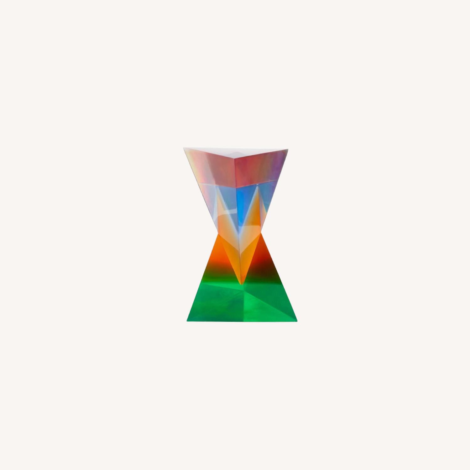 Seller's Notes:Neo Geo Drinks Table is made from counterbalanced pyramids of jewel-toned acrylic that visually meld to look different from every angle.