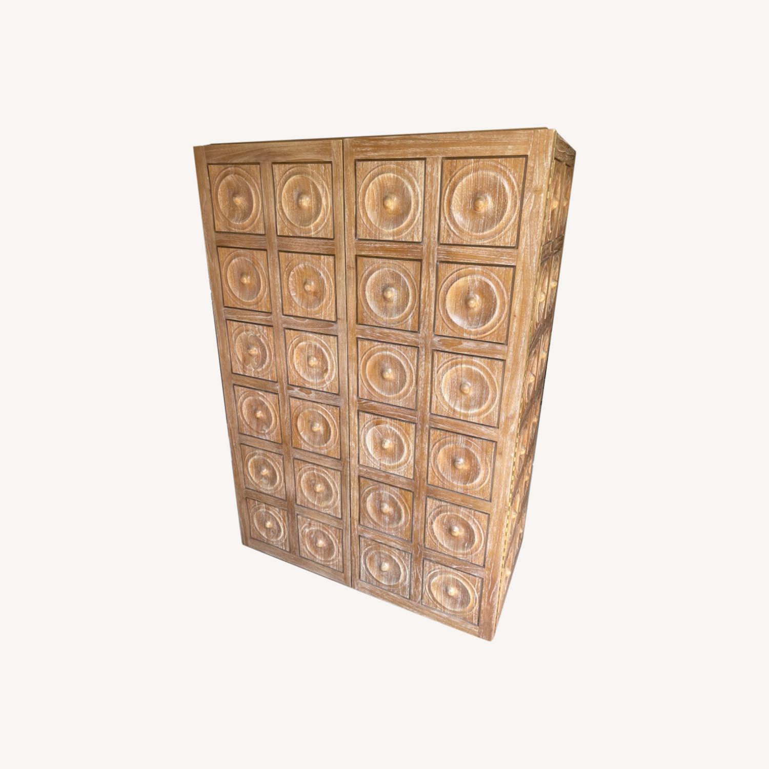 Seller's Notes:Recently moved and unfortunately no longer have space for this one of a kind piece. It’s been in my climate controlled garage for a few months. This color is no longer offered by Jonathan Adler, as it’s only for sale in black for $4200: https://jonathanadler.com/products/antwerp-circles-cabinet-29801 Rendered in durable, warm, limed mindi wood it boasts a strong presence. It's also fabulously functional two doors conceal adjustable shelves and three slow close drawers.