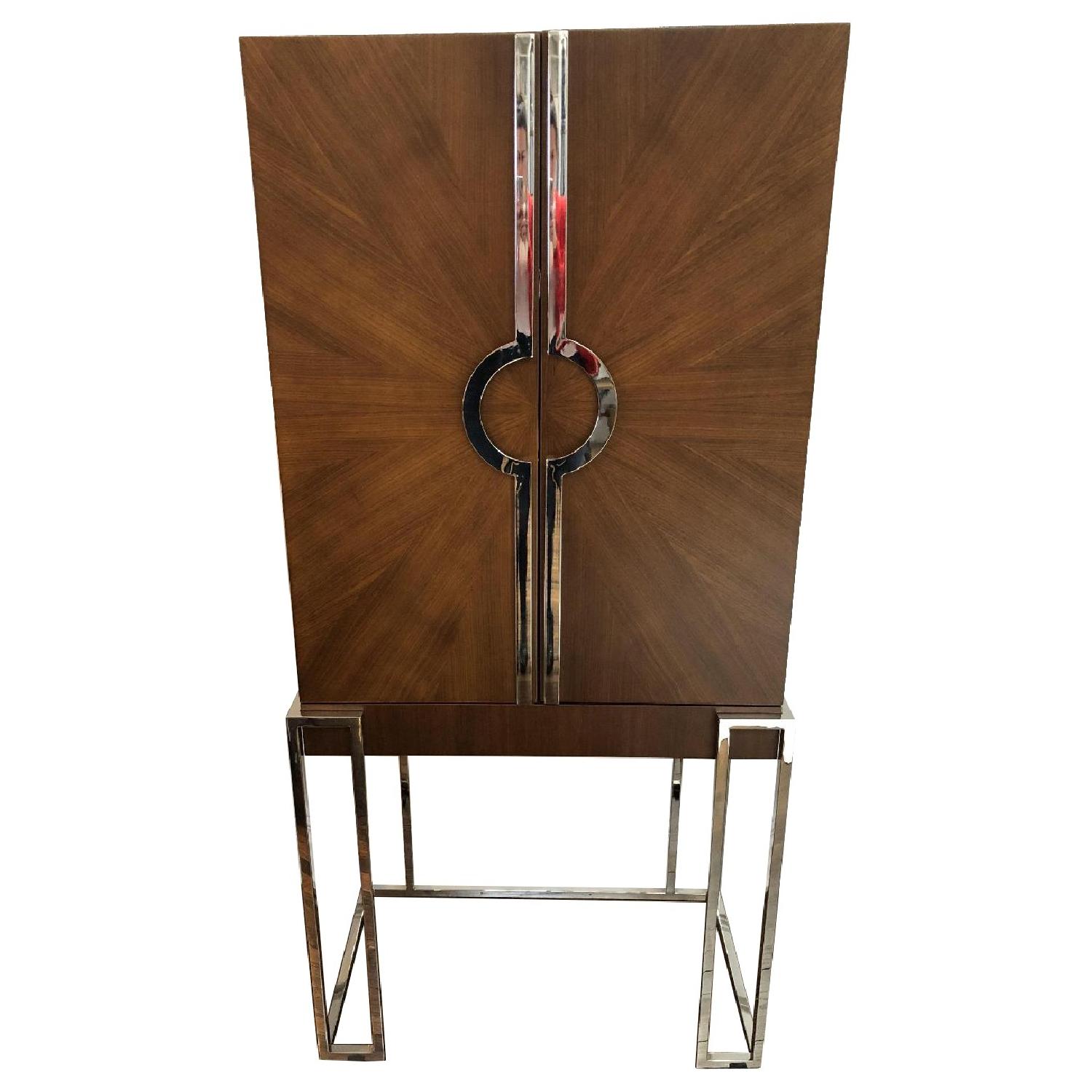 Seller's Notes:Beautiful Jonathan Adler brown wood and chrome Bar Cabinet. Mirrored interior with adjustable glass shelves. Cabinets are ever so slightly unaligned as seen in the last photo. Not noticeable.