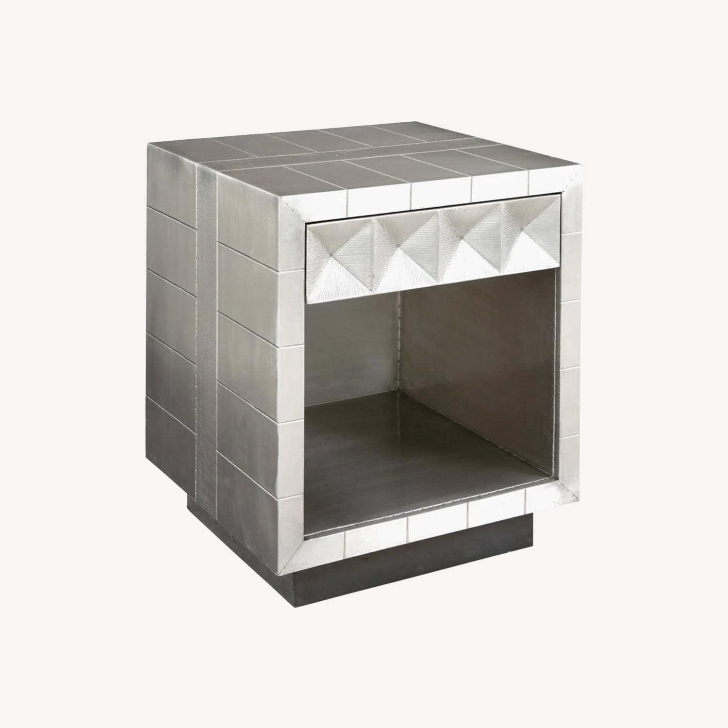 Seller's Notes:A chic companion in the boudoir, our Talitha Bedside Table is crafted from nickel-plated metal with hand-stamped patterns applied to a minimalist form. The surface is reminiscent of silver leaf—it emits that same lustrous glow—but is wonderfully durable. Let the geometric stud pattern shine in a glamorous lair or read more rock 'n' roll in a more minimalist space.