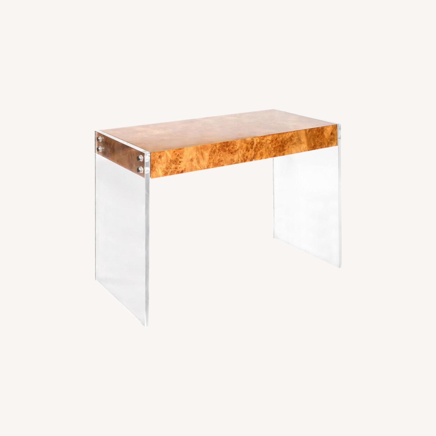 Seller's Notes:From Jonathan Adler's chic burled wood collection—pieced mappa wood floats between clear acrylic legs with stainless steel accents. Fully finished drawers with hidden pulls create a clean silhouette that's fierce from any angle. Work its minimalist magic as a small desk or stylish console. This desk looks super luxe and basically brand new. 45" W, 20" D, 31" H Natural burled mappa wood with clear acrylic legs Two (2) drawers with hidden pulls and soft, self-close slides Polished stainless steel hardware Fully-mitered construction Naturally long-wearing finish