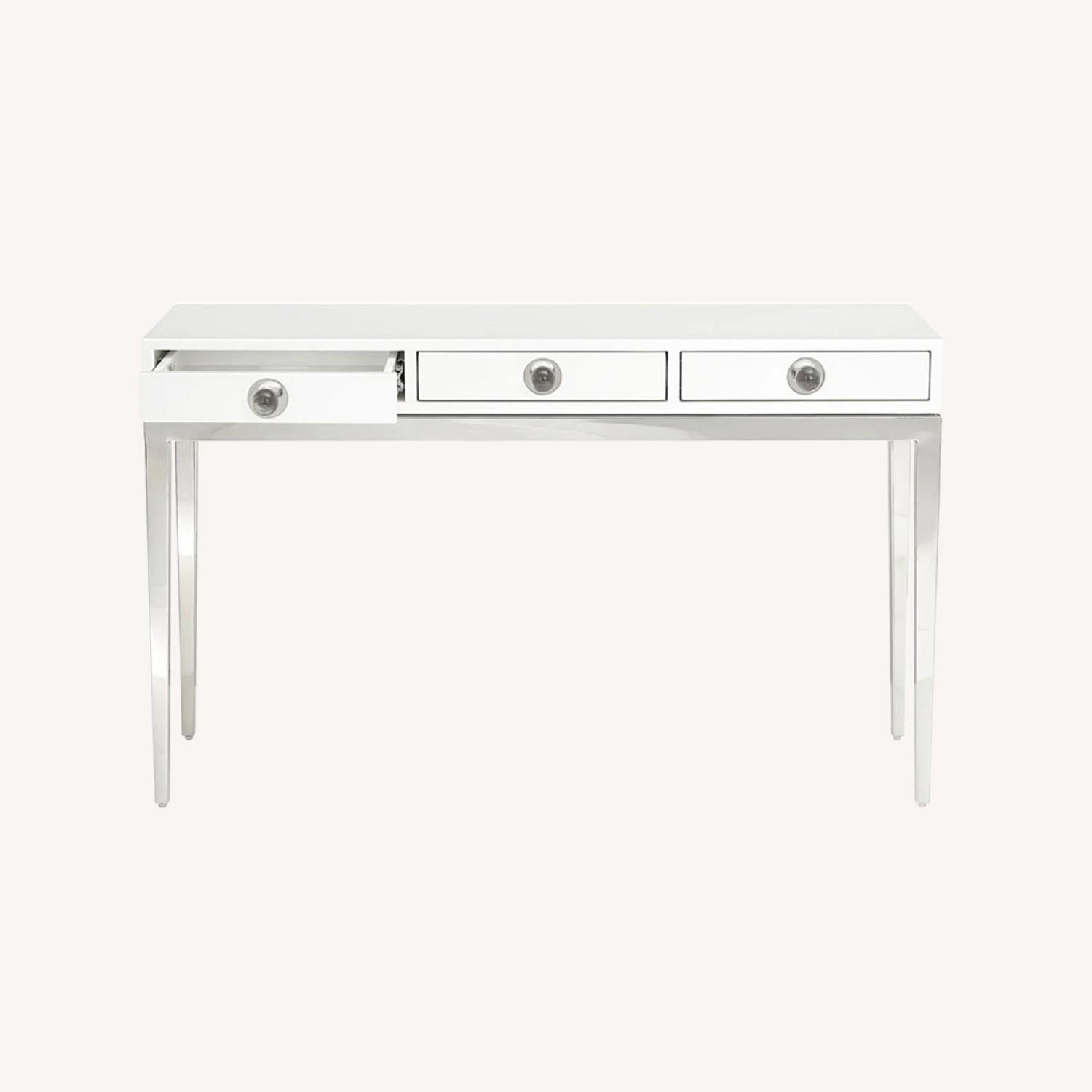 Seller's Notes:three-drawer console is finished in glossy white lacquer and features polished accents with oversized acrylic knobs