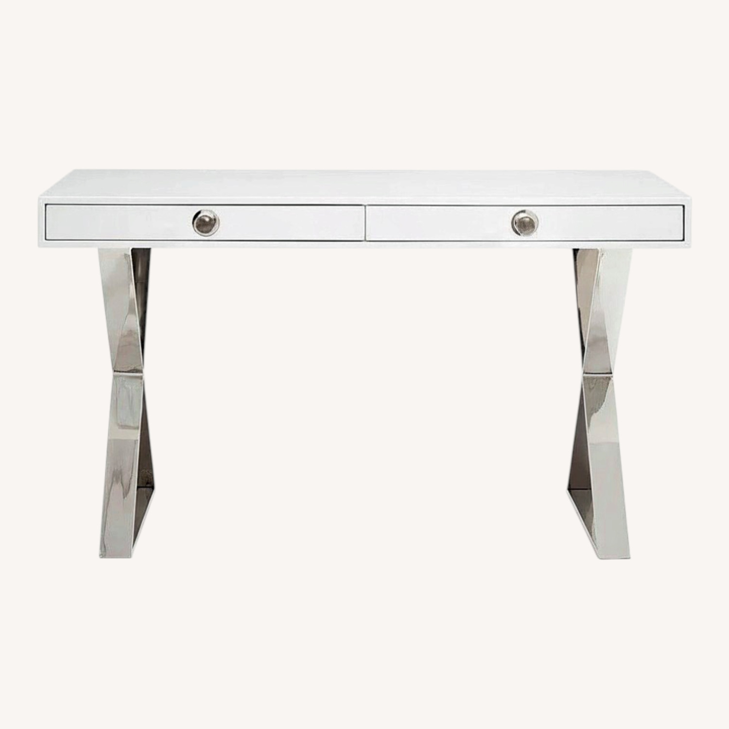 The piece remains beautiful, sleek, and modern. Its design is particularly well-suited for even two people to sit opposite one another comfortably. The desk includes a customized glass top.