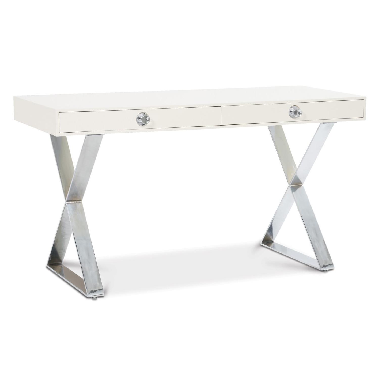 Seller's Notes:Stunning brand new Jonathan Adler Channing Desk. Absolutely new, never used. Delivered from the store a few weeks ago. Selling because it does not fit into our space. It's sitting covered in our entryway, ready to go. Glossy white lucite top, nickel legs and clear lucite knobs. Two drawers with gliding mechanism. Perfect for small spaces. In a few of the photos you will see string coming out of the drawers. This is where the glass knobs (included in a separate small box) are to be installed, as shown in photo. http://www.jonathanadler.com/furniture/desks/channing-desk/7208.html