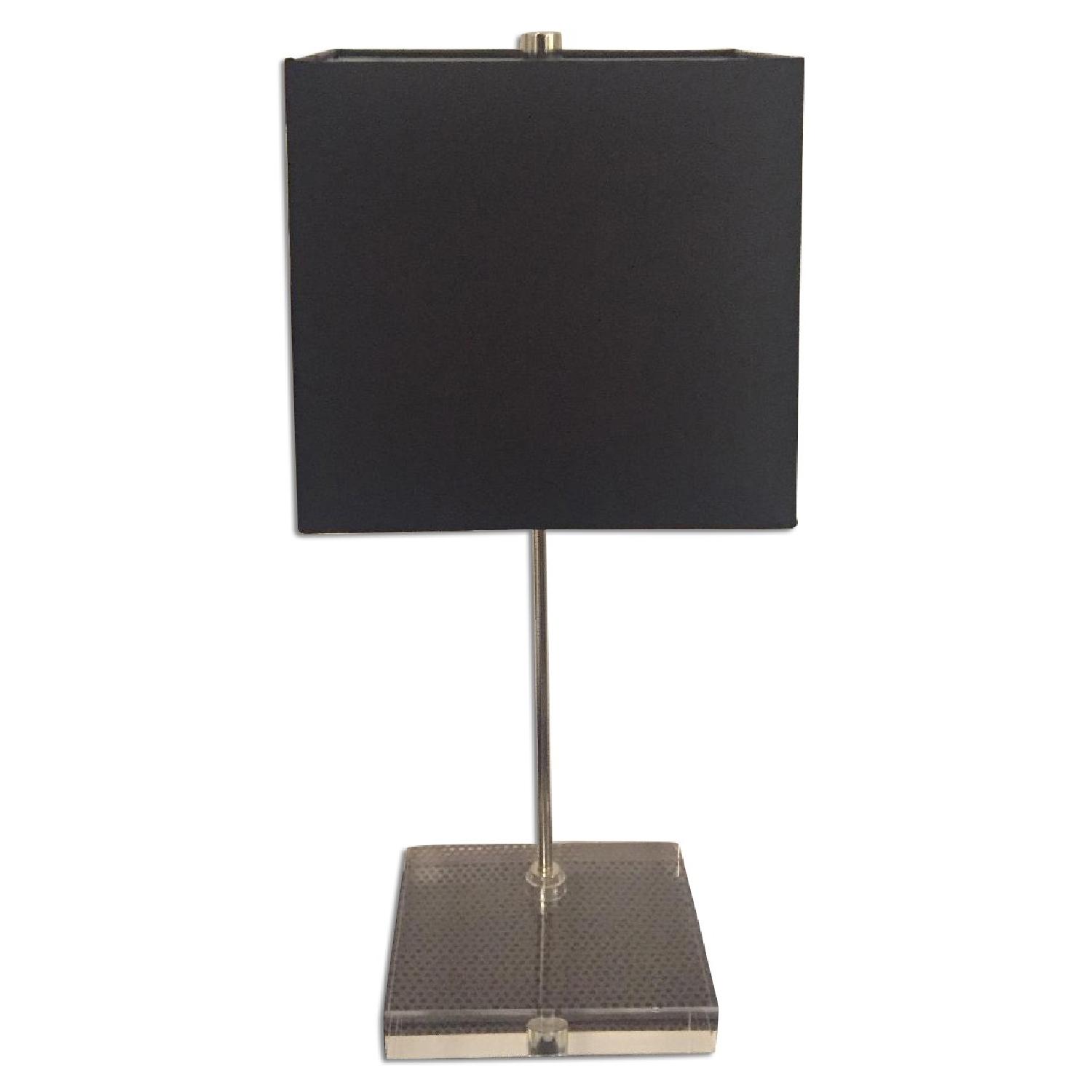 Seller's Notes:Completely sold out lucite-based table lamps with black silk shade. Can place pottery, plants and more on base of lamp to feature nicely under light - instant gallery vibes! Extra long translucent cords make this perfect for the bedside!