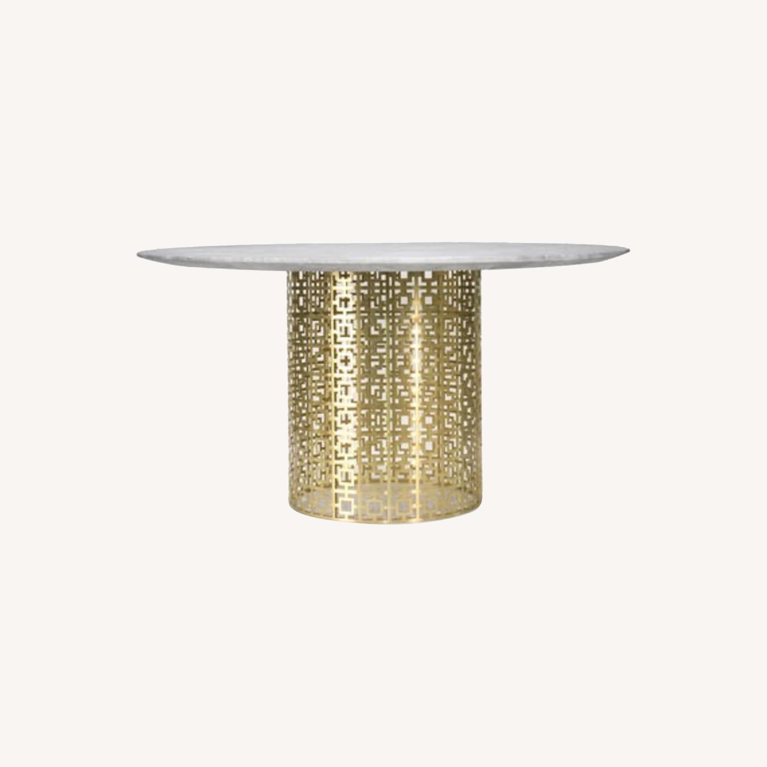 Seller's Notes:Polished brushed brass of couture tabletop, including white marble tabletop. Base: 23" Diameter , 27" H Marble Top: 54" Diameter Comfortably seats six for an ideal dinner or for your living room. Signature Nixon pattern rendered in brushed brass provides a sophisticated perch with a white marble couture tabletop.