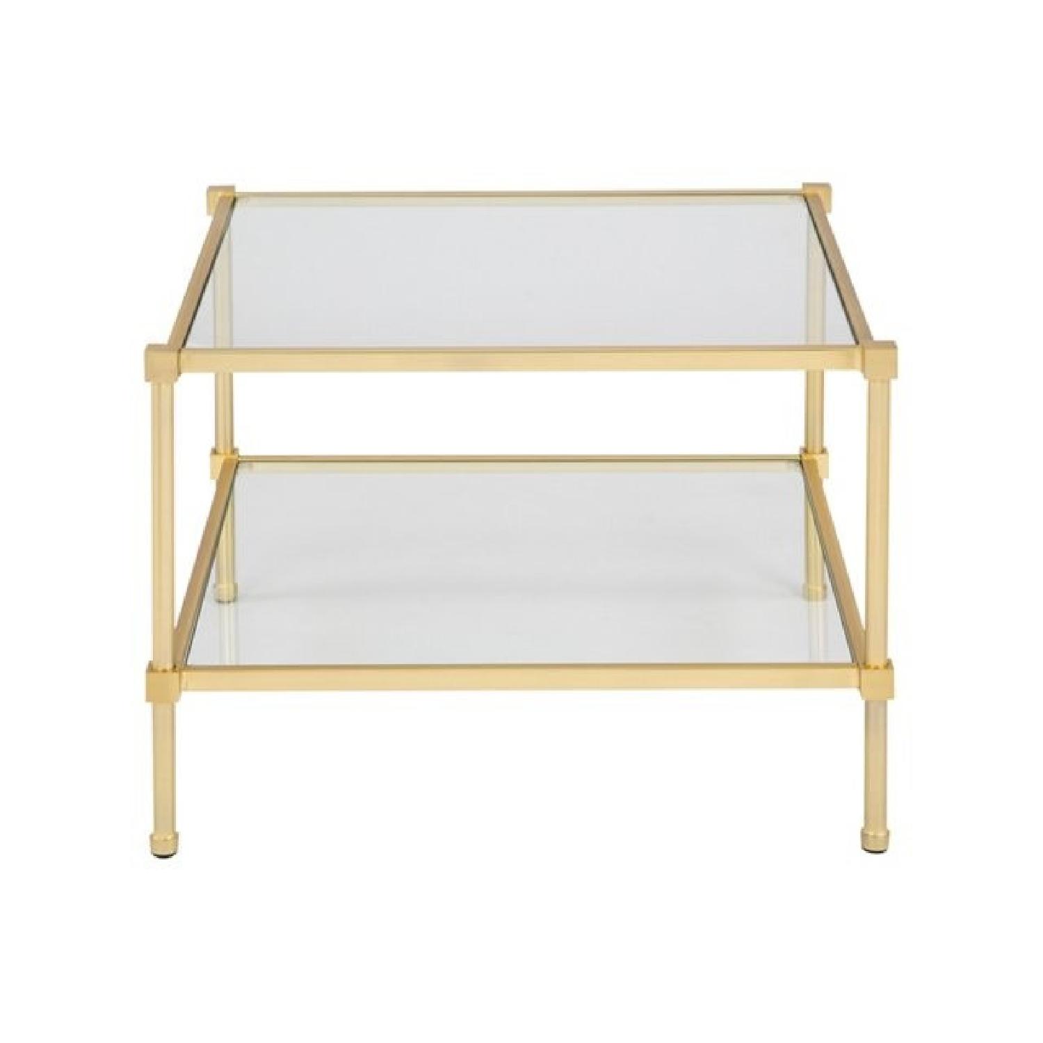 Seller's Notes:Jonathan Adler Meurice Bi-level Coffee Brass frame with glass tops Signs of wear on the frame, many of which can potentially be polished/buffed out Minor scratches on glass - visible only in certain light Selling because moving!