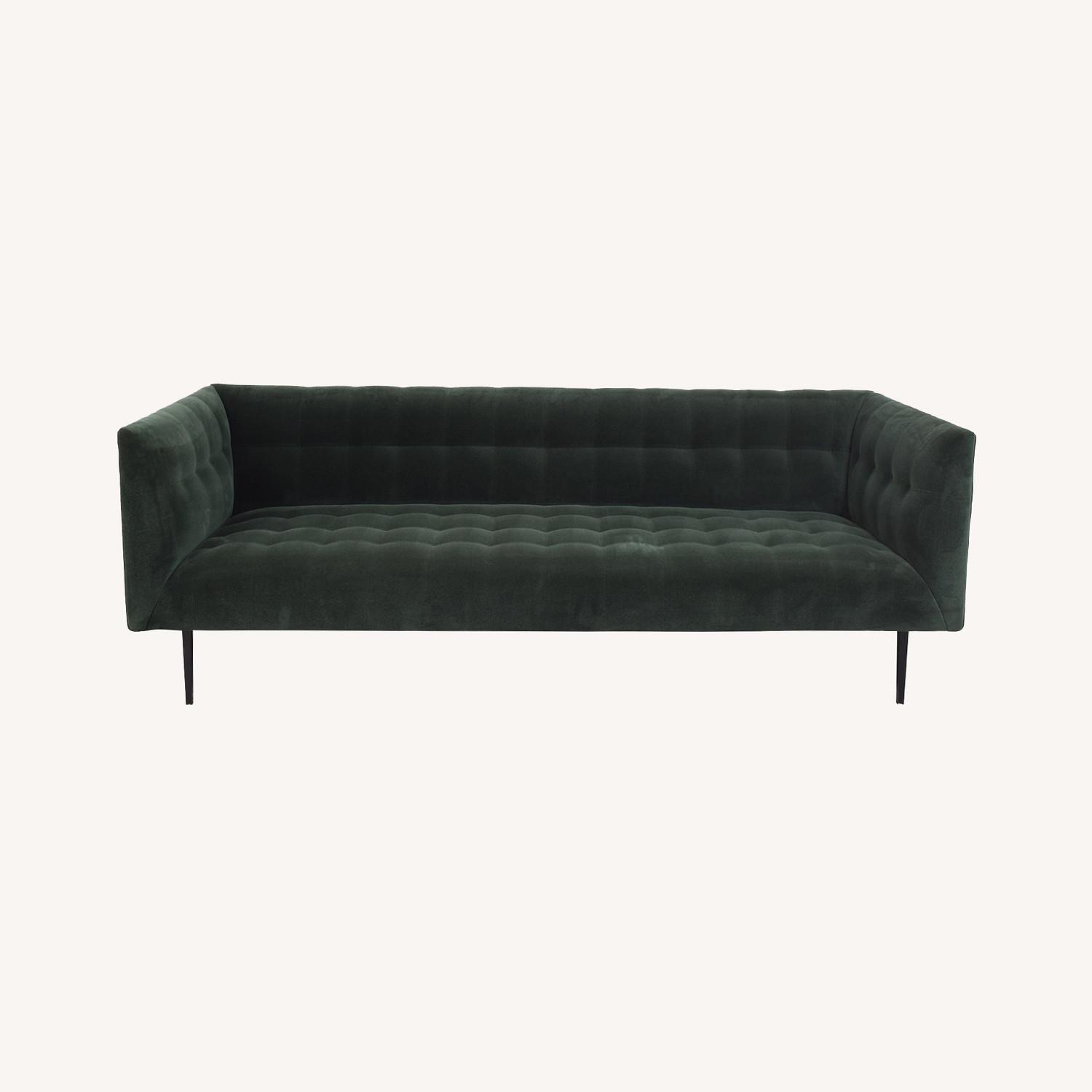 Seller's Notes:Hello! For sale to a good home: a top notch, design-forward, nearly-new sofa at a wild discount. What is this? A cool, cozy, low, luxurious, sleek statement sofa that you can nest into. Works for daily use, hosting friends, or watching Netflix all day long if you like. Buttery velvet resists wear. Easily seats 3, or two people who feel like stretch out. What color is? Monitors may vary. I'd describe it as deeper than forest green. It won't overpower the rest of your living room decor. How clean is it? I had it professionally cleaned 1 week ago to facilitate sale. How used? It's not. I purchased and then had to store it almost immediately, so I could stay with my fiancé for most of last year. Since then I've relaxed on it for 2 weeks max. Excellent condition. Why? I love this sofa, but I'm moving in with my partner who's got one they love more. But let me repeat: I love this sofa. You might too. How's it feel? Awesome. Also, medium-firm. You won't get lost in it, but you won't want to get up. Perfect for working from your laptop, long conversations. Etc. **Note: This piece is priced to sell. However if your move-in date isn't until 9/1, I can hold onto it until then for you. Your call. Brand: Jonathan Adler Dimensions: 87" W x 31" H x 35" D