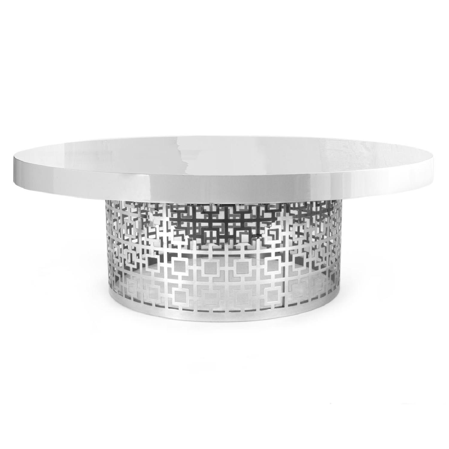Seller's Notes:I am moving to Chicago and redecorating my apartment once I get there. I bought this Jonathan Adler coffee table for my first ever one bedroom in the West Village in NYC. This white lacquer and nickel piece was the most perfect table for my graphic glam aesthetic and it is absolutely gorgeous. The Nixon Cocktail Table is a chic conversation piece. Nixon pattern rendered in perforated nickel provides a sophisticated perch for your choice of couture tabletop.
