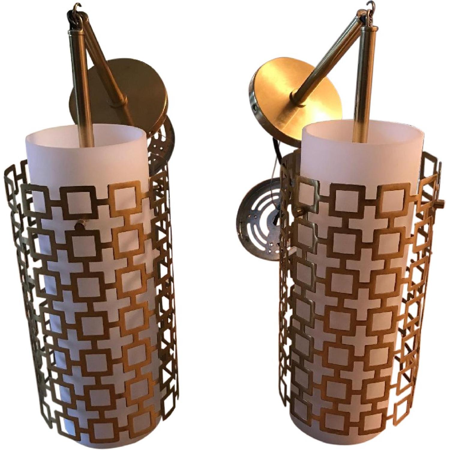Seller's Notes:These two Jonathan Adler sconces were purchased a few years ago. We are redecorating, and they no longer go with our decor. These are the Brass color. They are sold as a pair. From the Jonathan Adler website: "Park Ave Twinkle With a Graphic Twist. Our Parker Pendant Sconce features our classic Nixon pattern in a sleek, laser-cut metal iteration, further illuminated by the clean backdrop of the frosted cased glass interior shade."