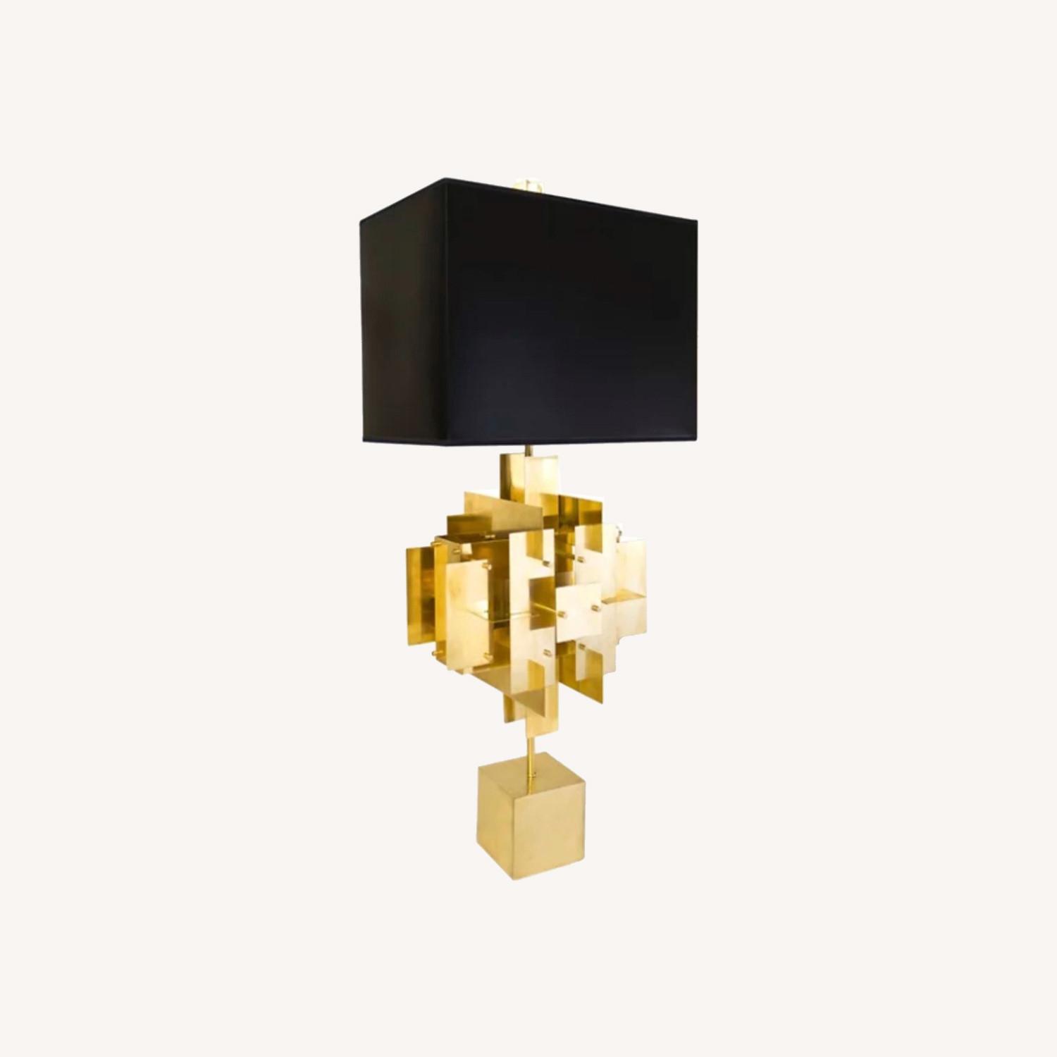 Seller's Notes:Inspired by a house of cards, our Puzzle Table Lamp is made of sheets of solid brass layered in a dynamic composition and is topped with a moody matte black shade. The architectural modernist feel is warmed up by the luminous metal. Greet your guests with a pair on your foyer console. • 17" W, 12" D, 38.5" H • Shade: 17" W, 12" D, 12" H • 9.5" harp • 8" dark brown cord