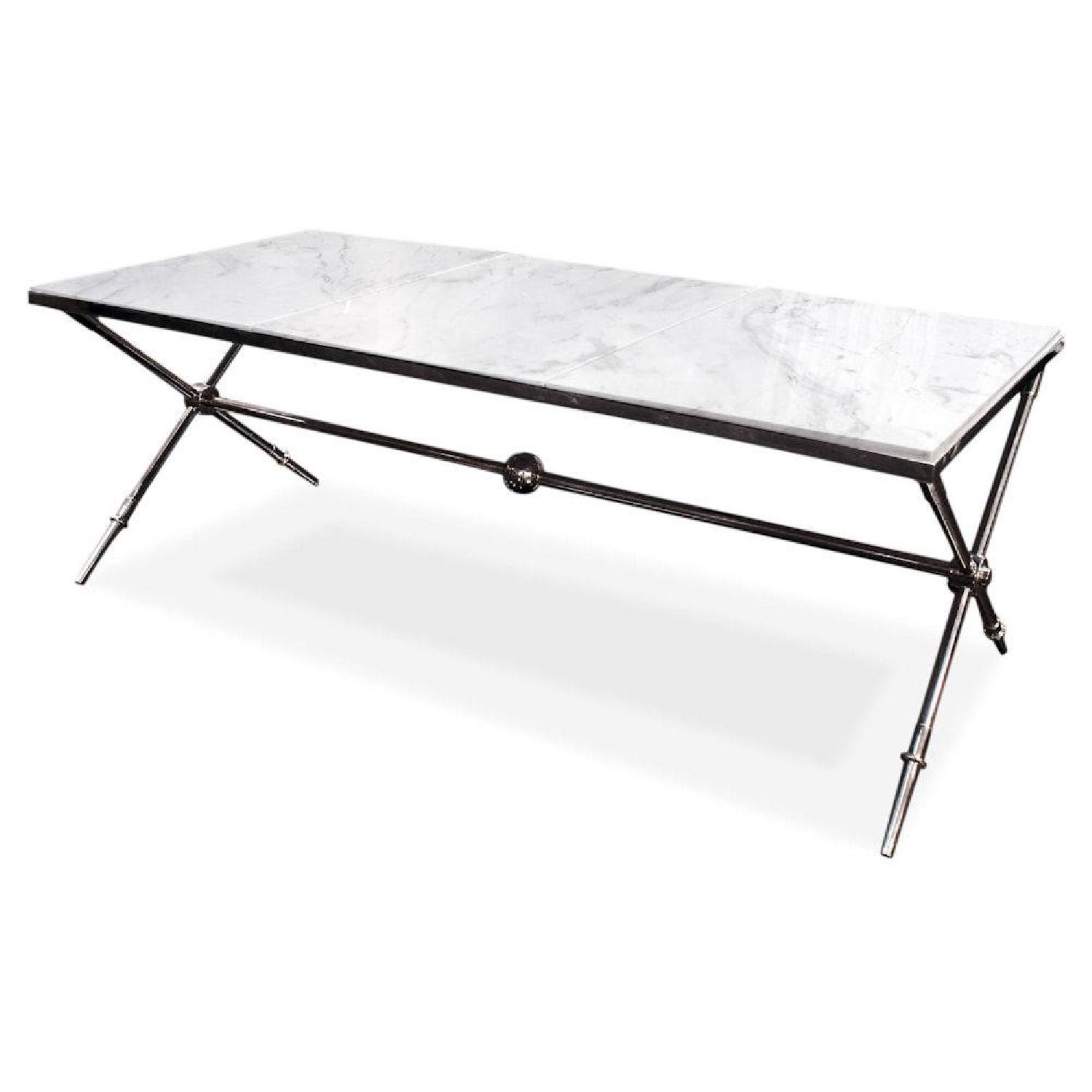 Seller's Notes:White and silver-tone Jonathan Adler Rider cocktail table with sabot detail at feet, polished nickel finish, white marble top in three sections and brand plaque at underside. Interior Designer selling Staging Furniture. This was used in a home for sale. There are some minor scratches and one of the pieces of stone has some minor chips (photo 3)