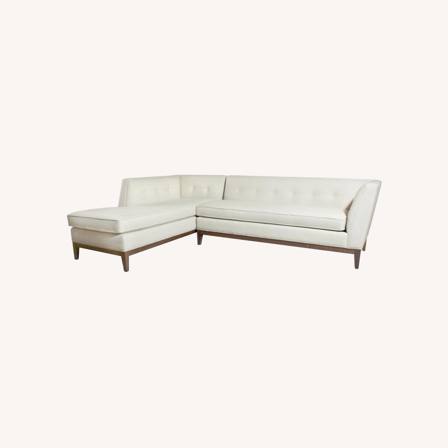Seller's Notes:Jonathan Adler Danner Left Facing Sectional Couch, Tangier’s Sand with walnut base. A mix of linen and cotton fabric. Great couch, just doesn’t fit in my new space. Minor stains and discoloration that can be removed with professional cleaning. 105" W, 74" D, 30" H Seat height: 19" Sofa: 72" W, 32" D, 30" H Chaise: 33" W, 74" D, 30" H