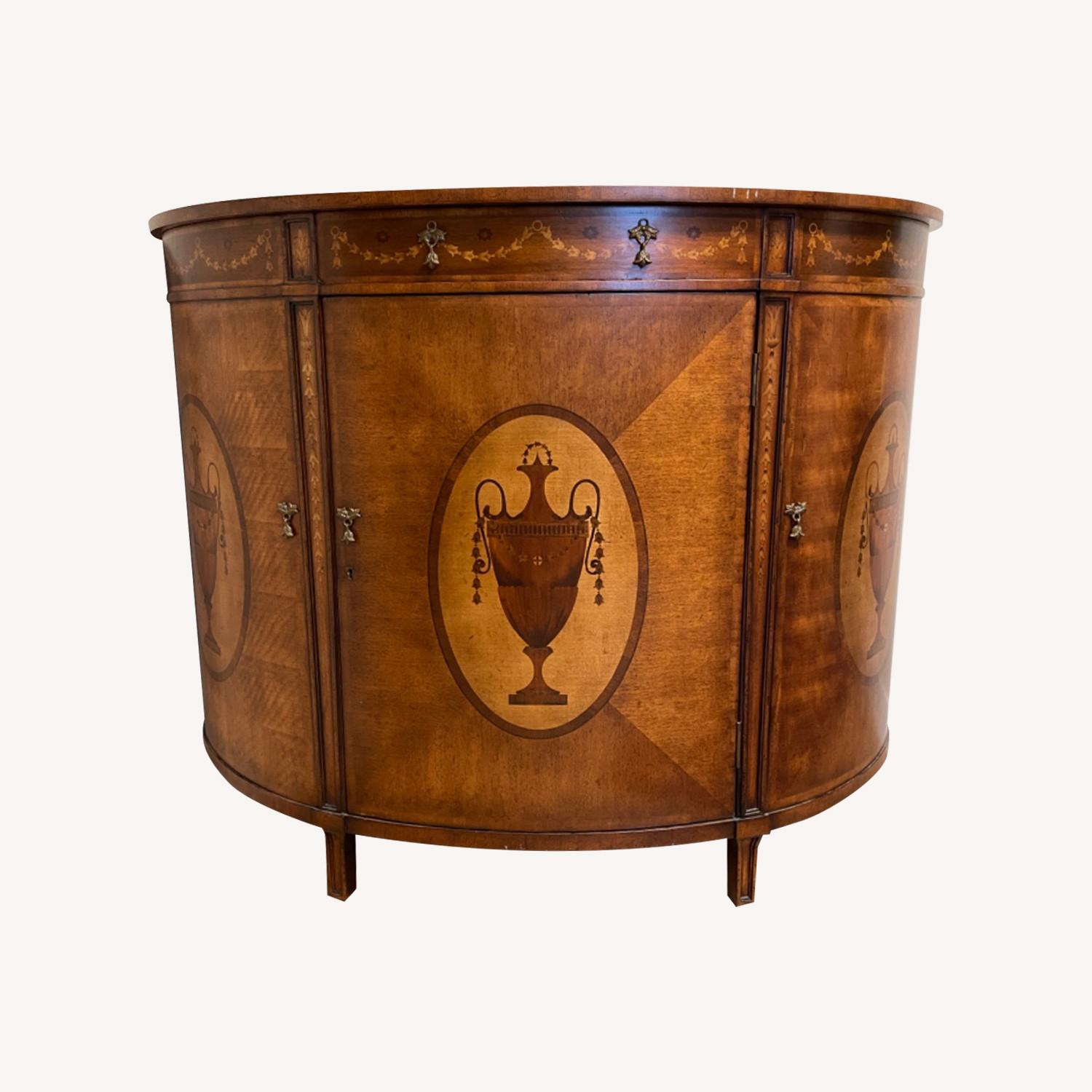 Seller's Notes:Beautiful wood inlays demilune cabinet. Originally designed for a tv to be housed inside, this piece has none of the tv hardware installed and instead is fully open for interior storage.