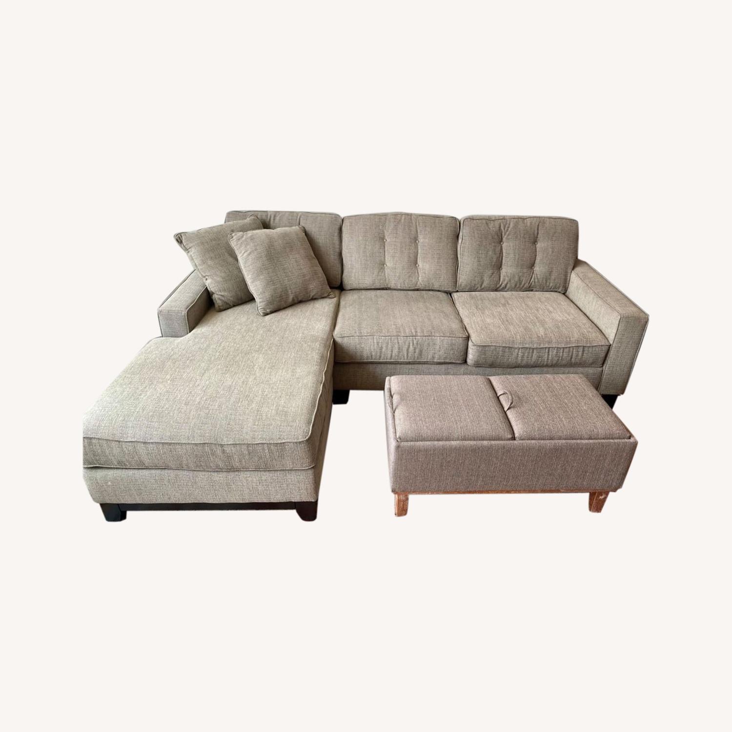 Seller's Notes:L-Shaped, 2 Piece Sectional In great condition! Dimensions: 90W x 65D (the longest part) x 29H Color: Beige Brand: Jonathan Louis (Ottoman not included)